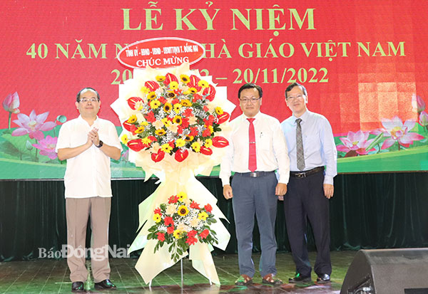 Đồng chí Quản Minh Cường, Phó Bí thư Tỉnh uỷ, Trưởng đoàn Đại biểu Quốc hội tỉnh tặng lẵng hoa cho các thầy, cô giáo Trường đại học Đồng Nai nhân kỷ niệm Ngày nhà giáo Việt Nam 20-11