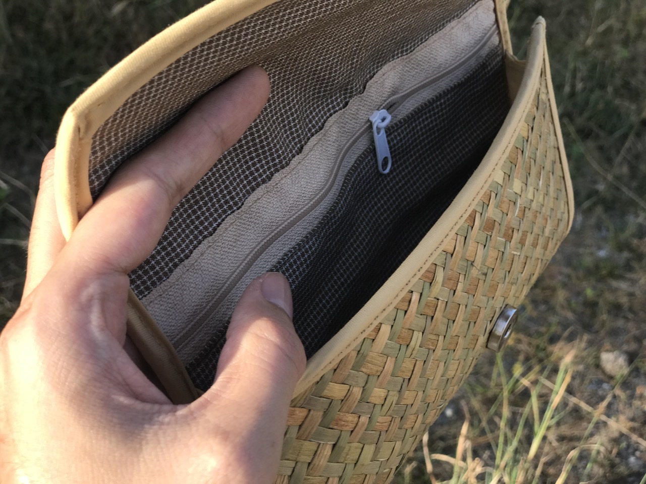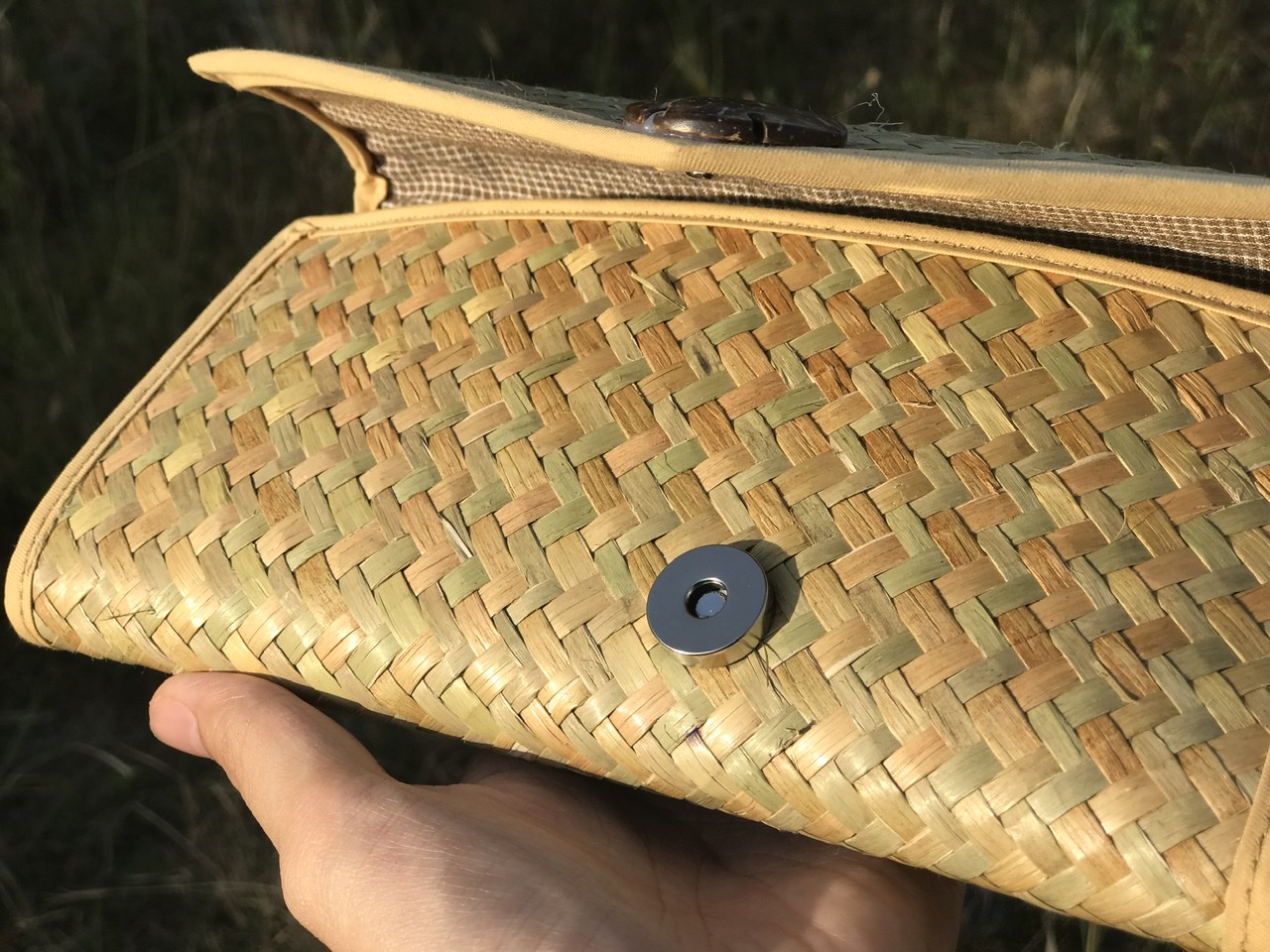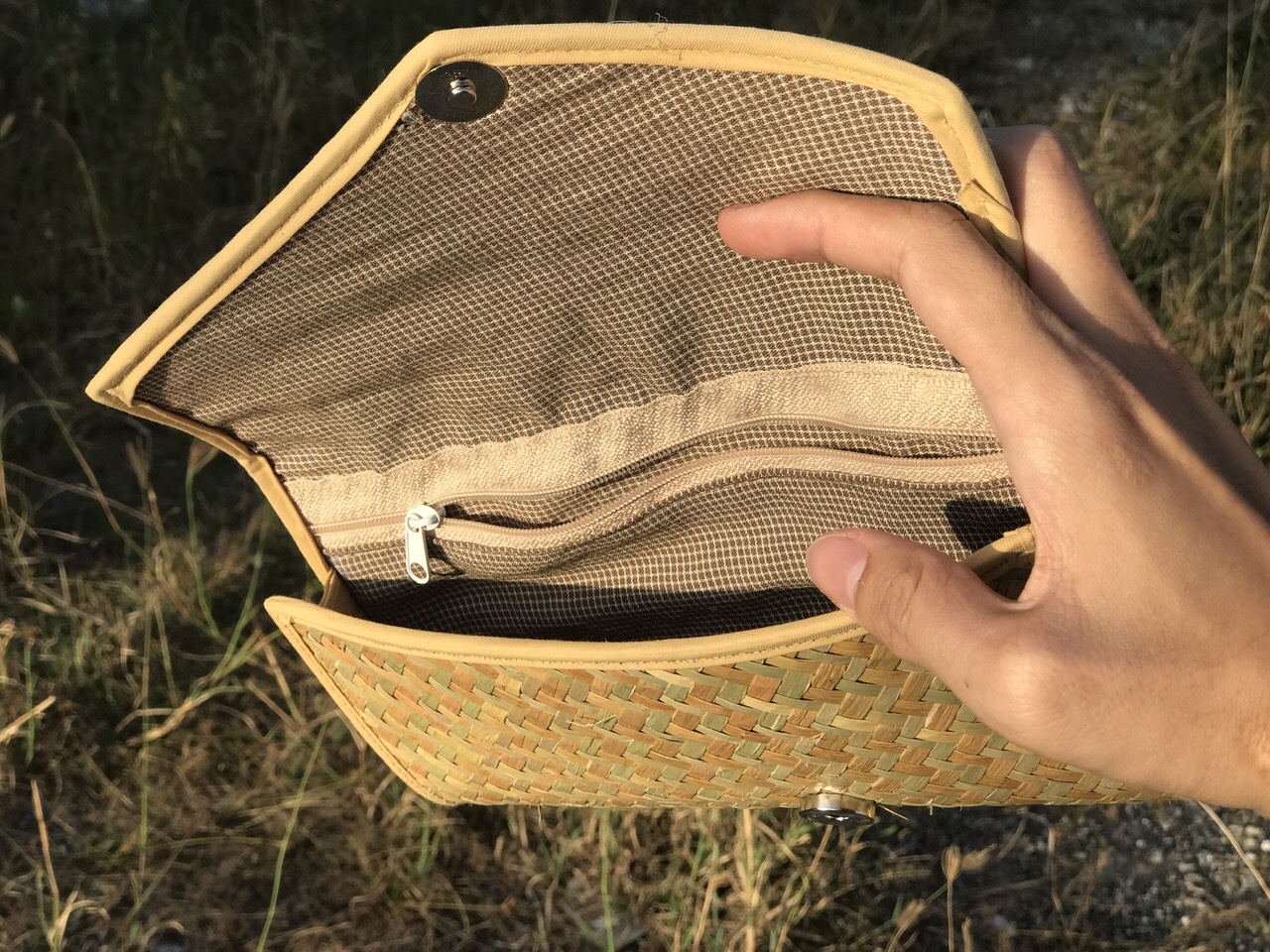 - Lớp ngoài được đan bằng cỏ bàng, với các đường đan tinh tế, tạo nên bộ khung của ví. Lớp viền bằng vải bên ngoài có thể tạo nên cảm giác mềm mại để người dùng để cầm nắm