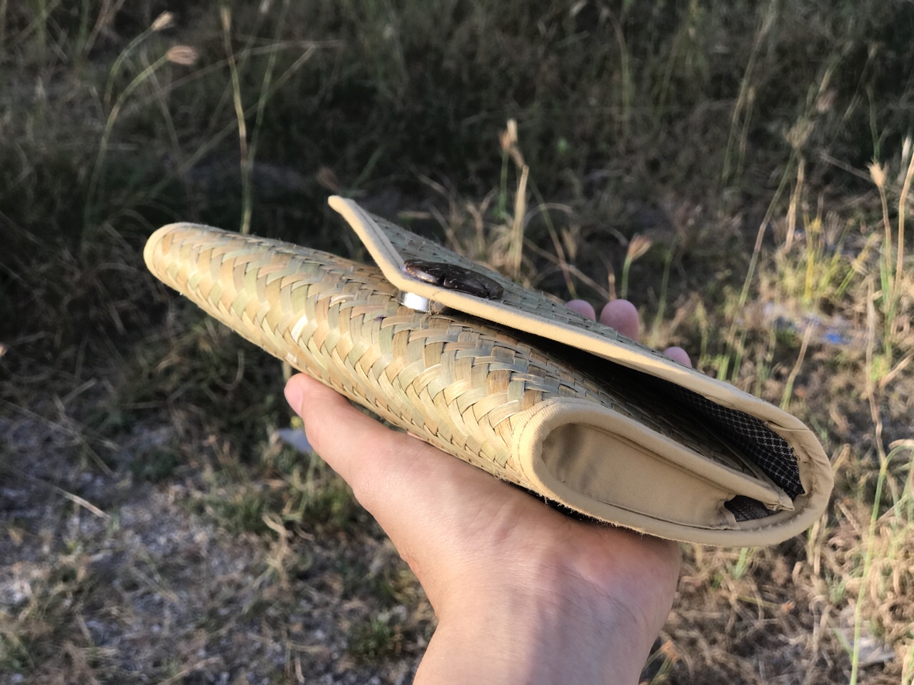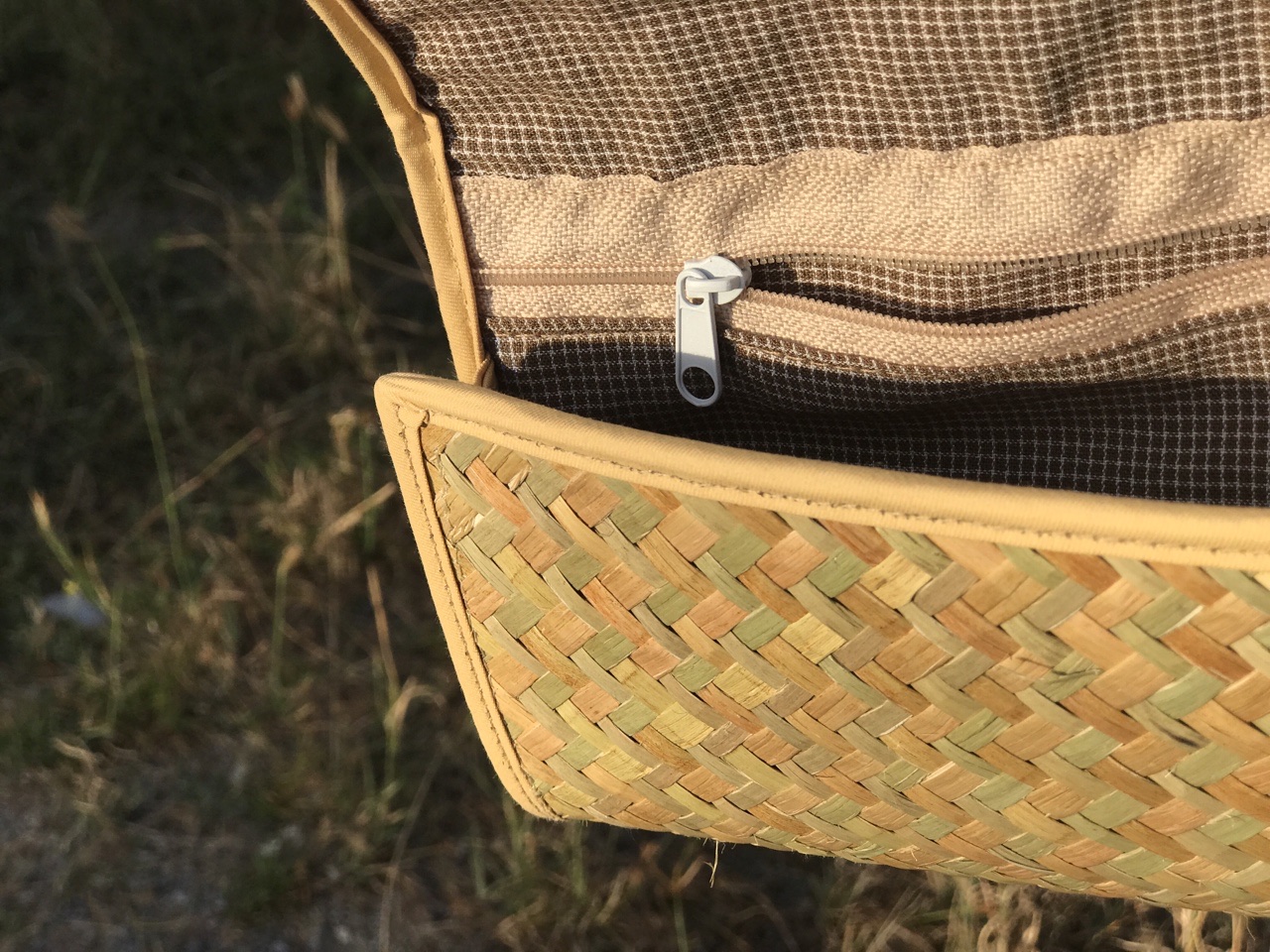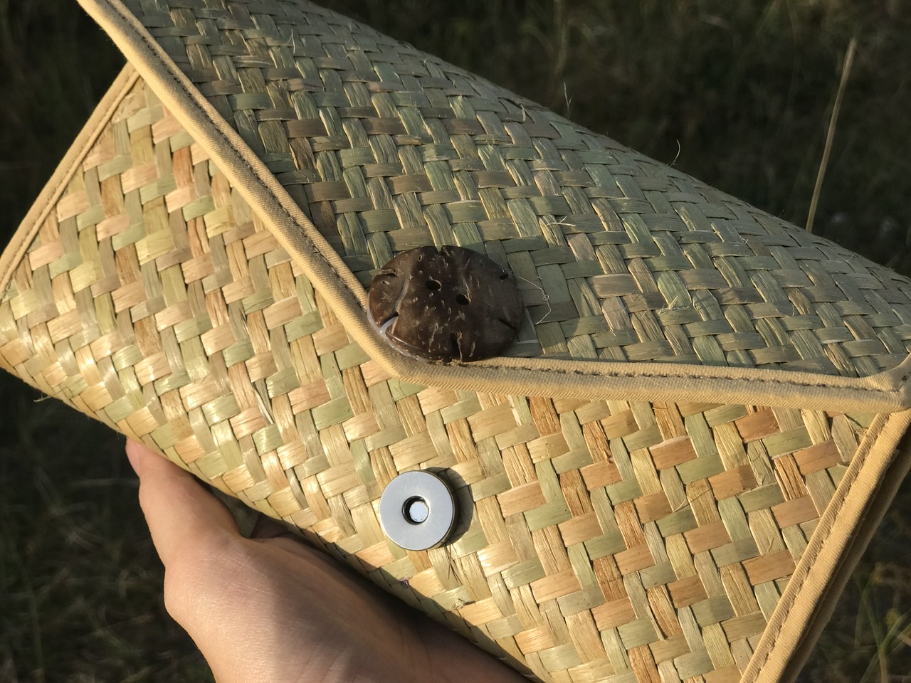 - Lớp ngoài được đan bằng cỏ bàng, với các đường đan tinh tế, tạo nên bộ khung của ví. Lớp viền bằng vải bên ngoài có thể tạo nên cảm giác mềm mại để người dùng để cầm nắm