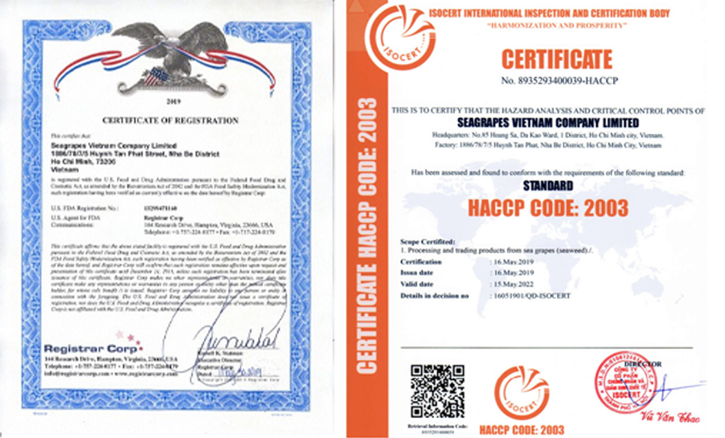 - Đạt chuẩn Hoa Kỳ: Chất lượng rong nho đạt tiêu chuẩn xuất khẩu vào các thị trường khó tính nhất như: Mỹ, Nhật, Châu Âu. Bạn hoàn toàn yên tâm.