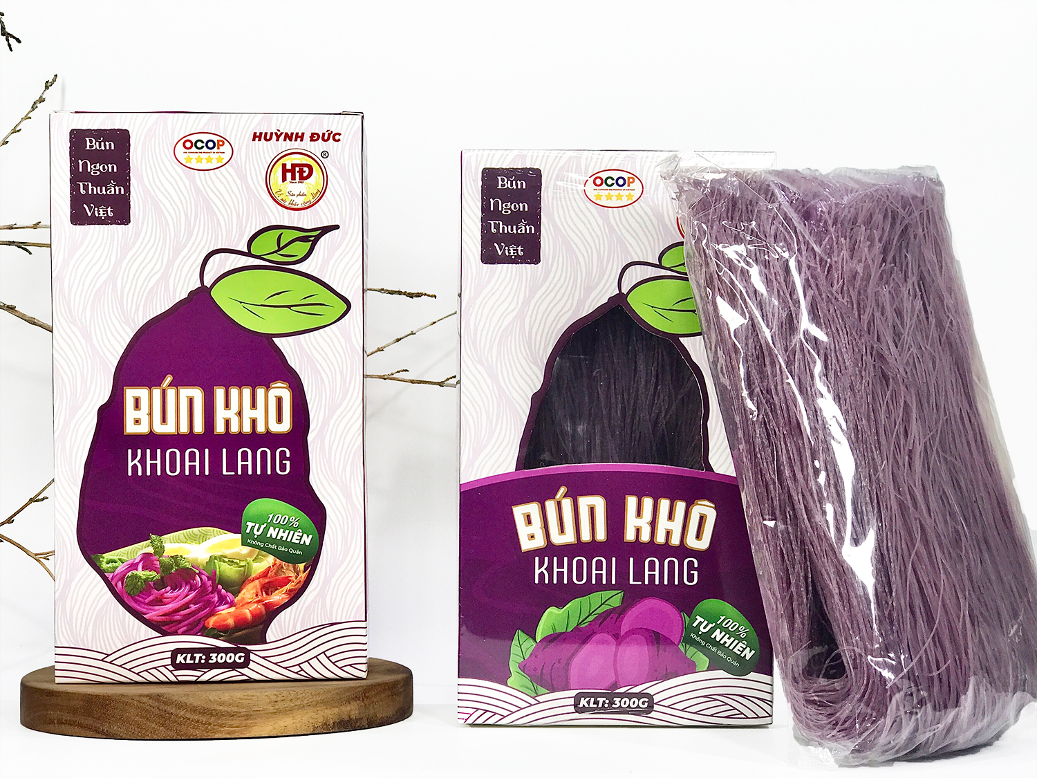 Bún khô Khoai Lang có nguyên liệu chính làm từ gạo, khoai lang tím, muối, nước, đặc biệt là 100% không chứa chất phụ gia. Sản phẩm đã đạt được chứng nhập OCOP là sản phẩm đạt an toàn vệ sinh thực phẩm.