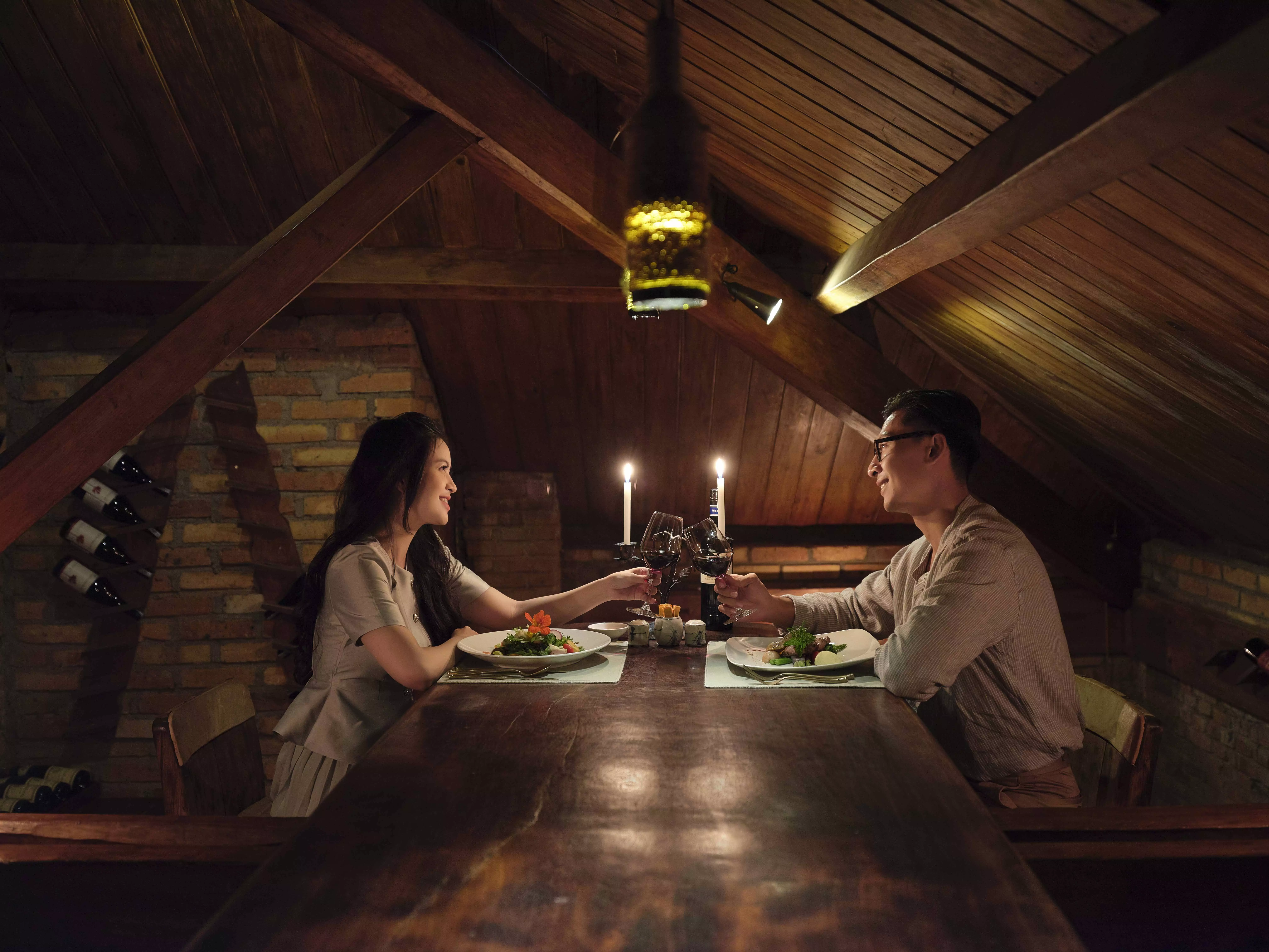 Đặc biệt, viên ngọc quý thực sự của nhà hàng nằm nép mình dưới mái nhà Mansard của nhà hàng – hầm rượu, nơi cất giữ bộ sưu tập rượu phong phú luôn sẵn sàng đón chờ giới mộ điệu trải nghiệm tiệc tối thân mật và ấm cúng trong không gian riêng biệt với 9 chỗ ngồi.