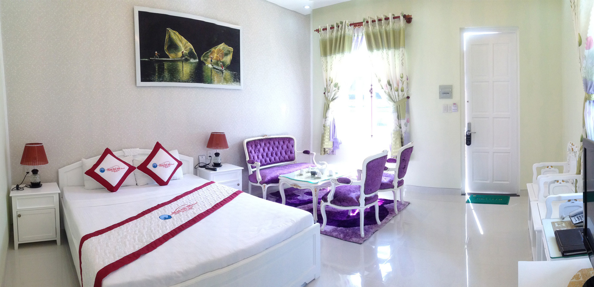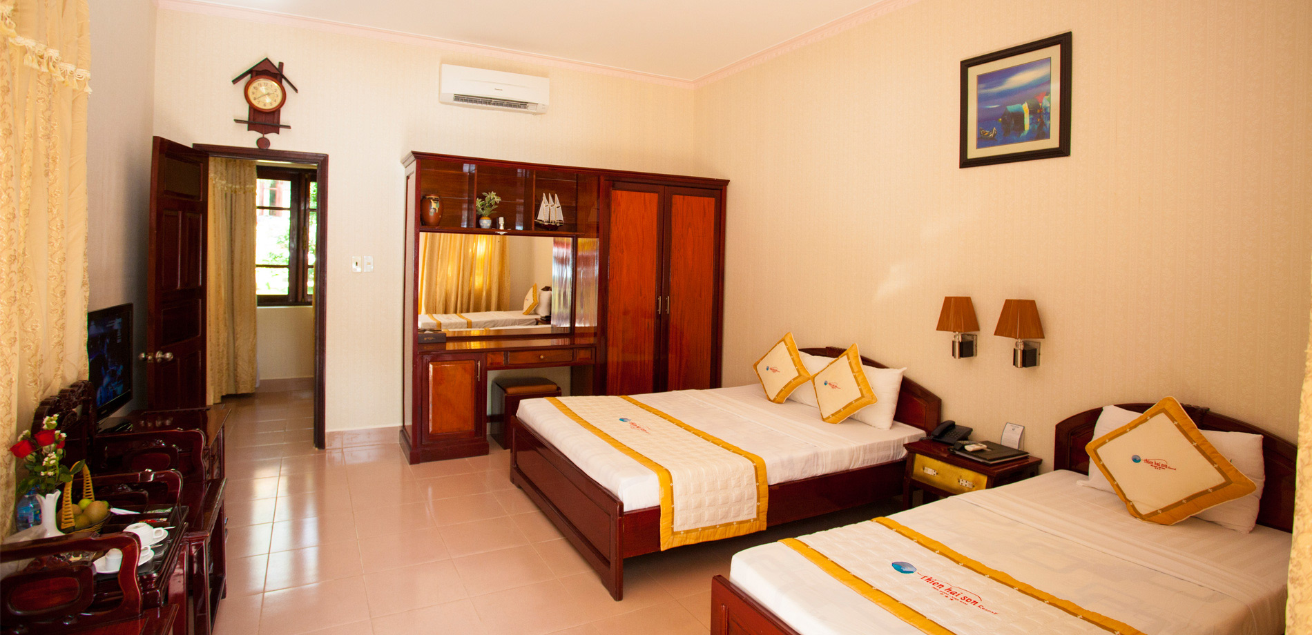 Hệ thống phòng nghỉ với 100 phòng đạt tiêu chuẩn 3 sao. Bao gồm 43 phòng khách sạn, 30 phòng biệt thự hướng biển, 10 phòng biệt thự sát biển và 1 cụm khách sạn 15 phòng sát biển và 02 phòng VIP. Tất cả các phòng đều có ban công riêng và được trang bị các tiện nghi vật dung đạt tiêu chuẩn 3 sao.