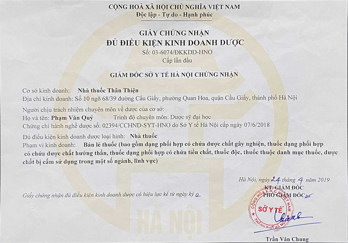 - Giấy chứng nhận đủ điều kiện kinh doanh dược số: 03-6074/ĐKKDD-HNO