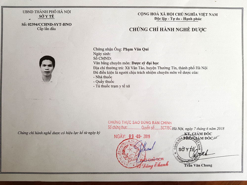 Chứng chỉ hành nghề dược của Dược si Phạm Văn Quí