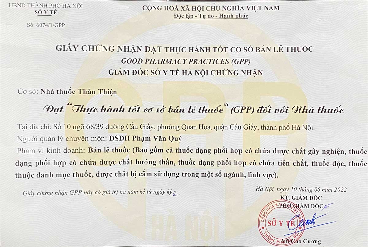 - Giấy chứng nhận đạt thực hành tốt cơ sở bán lẻ thuốc (GPP) số: 6074/GPP