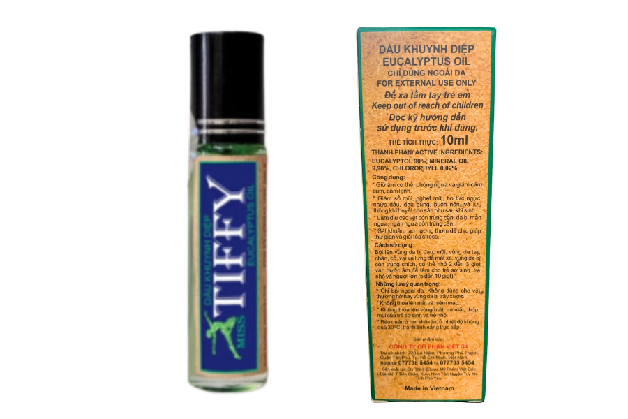 Dầu khuynh diệp Miss Tiffy là sản phẩm chăm sóc sức khỏe gia đình được chiết xuất từ tinh chất khuynh diệp nguyên chất kết hợp với các thảo dược thiên nhiên. Với đặc tính làm ấm, giảm đau và hỗ trợ hô hấp, dầu khuynh diệp Việt 54 giúp giảm nhanh các triệu chứng cảm lạnh, ho, đầy hơi và côn trùng cắn. Sản phẩm an toàn, dịu nhẹ, đặc biệt phù hợp với trẻ nhỏ và người lớn tuổi. Dầu khuynh diệp Miss Tiffy – lựa chọn thân thiện, chất lượng từ thiên nhiên, đồng hành cùng sức khỏe của bạn mỗi ngày.