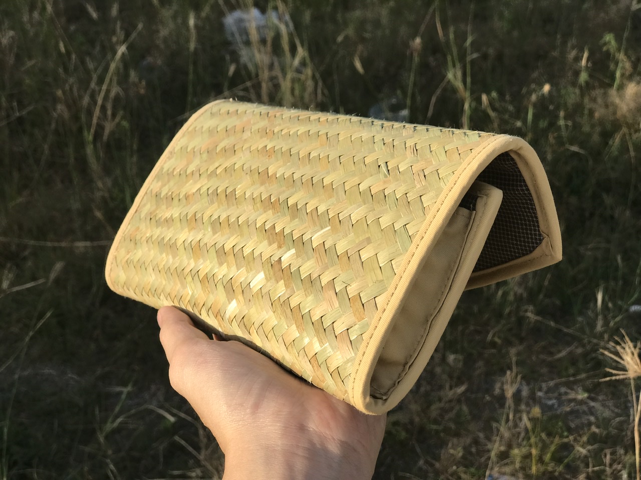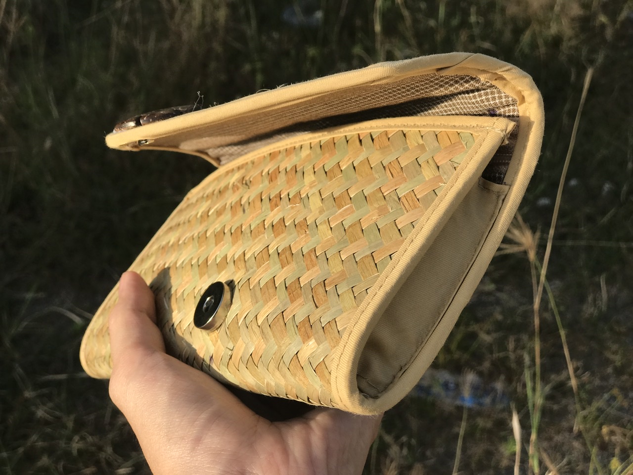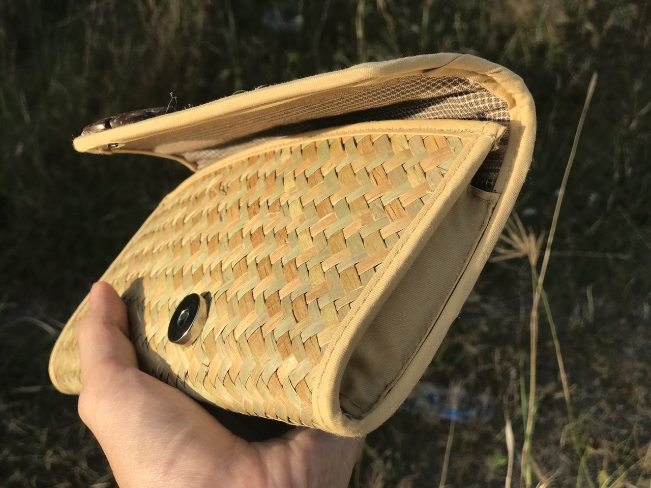 - Lớp ngoài được đan bằng cỏ bàng, với các đường đan tinh tế, tạo nên bộ khung của ví. Lớp viền bằng vải bên ngoài có thể tạo nên cảm giác mềm mại để người dùng để cầm nắm