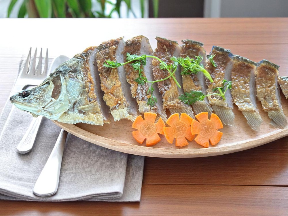 ướp cá với tiêu, tỏi, nước mắm, chiên vàng giòn.