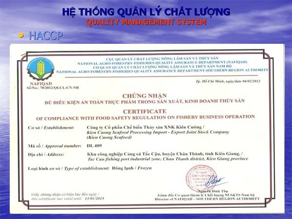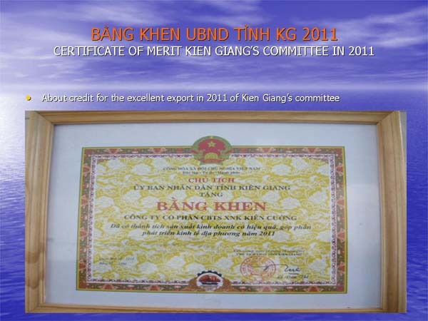 - Năm 2010: Được chủ tịch UBND tỉnh Kiến Giang tặng danh hiệu "Đã có thành tích xuất sắc trong xuất khẩu”.
