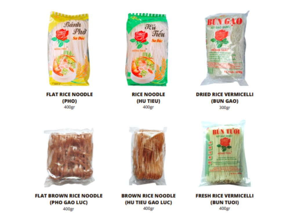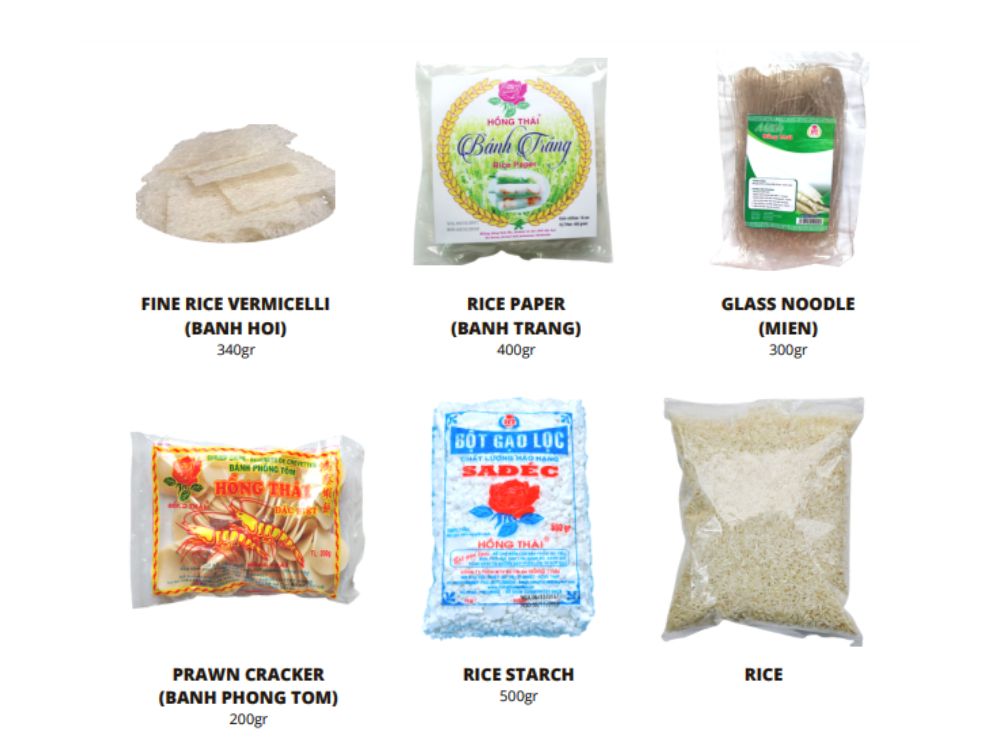 Tính đến thời điểm hiện tại, các sản phẩm như gạo các loại, bột gạo lọc Sa Đéc, hủ tiếu bột lọc, bánh phở, bún gạo, bún tươi, mì nui, hủ tiếu, phở gạo lứt, mì Quảng cùng các sản phẩm sản xuất từ tinh bột gạo khác…chính là những sản phẩm chủ lực được thương hiệu Hồng Thái cung ứng ra thị trường. Không chỉ đa dạng chủng loại, Hồng Thái còn tự hào với tiêu chí doanh nghiệp đảm bảo vệ sinh an toàn thực phẩm với hệ thống sản phẩm đạt chất lượng cao, đạt tiêu chuẩn xuất khẩu.