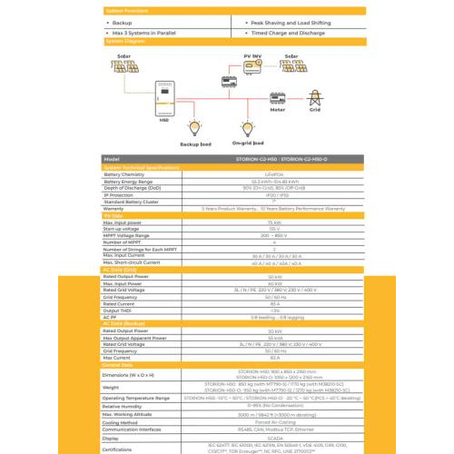 Storion-G2-H50 M38210-SC là hệ thống lưu trữ năng lượng dạng All-In-One tích hợp đầy đủ biến tần hybrid, hệ thống pin lithium-ion, bộ điều khiển thông minh, tủ điện và hệ thống làm mát trong một khối duy nhất. Với công suất inverter 50kW và dung lượng pin lên đến 104.8kWh, sản phẩm phù hợp cho các doanh nghiệp vừa và lớn, cơ sở sản xuất, và các dự án điện mặt trời cần lưu trữ điện lâu dài, hiệu quả.