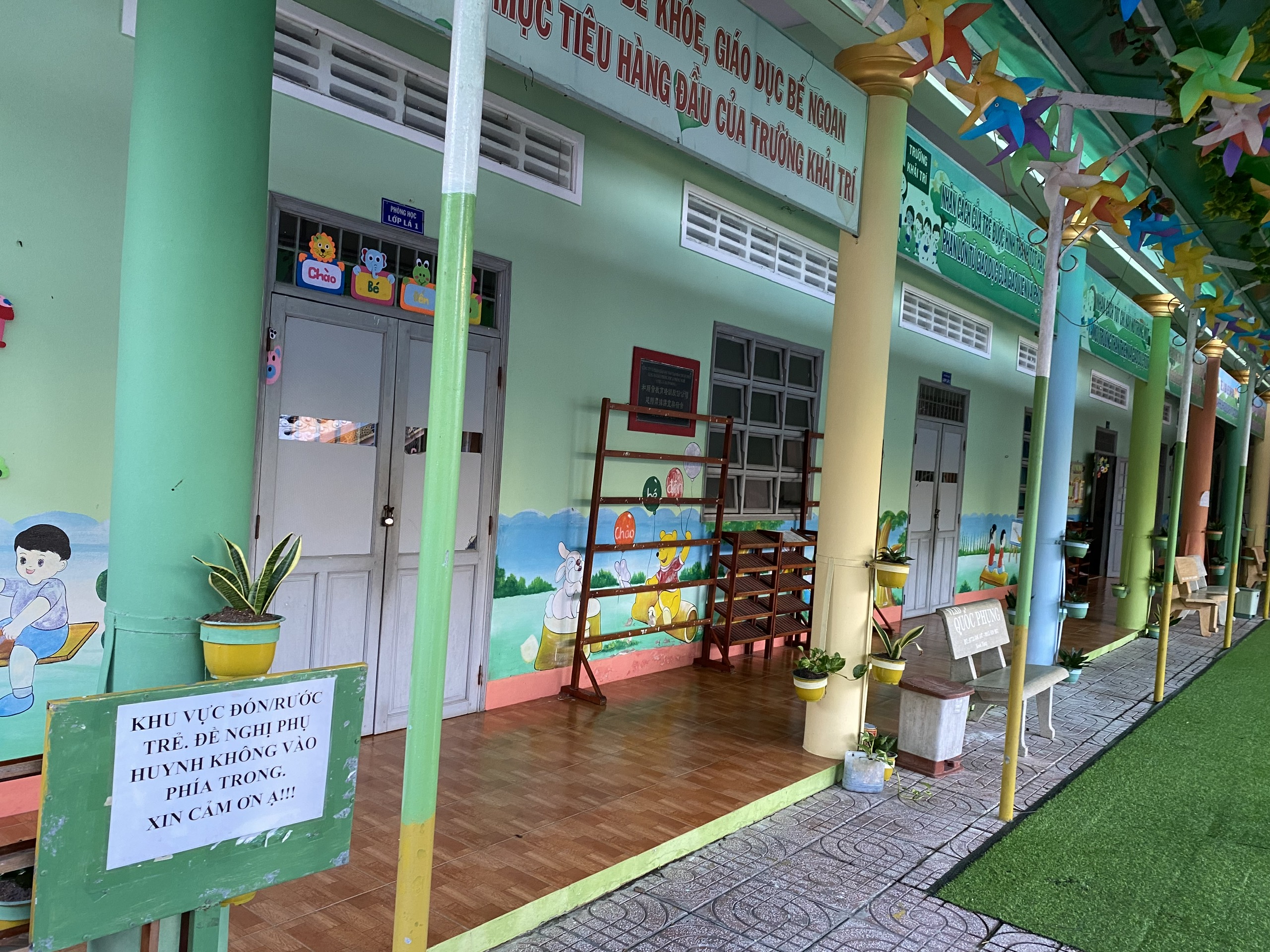 Không gian trường ấm áp, yên bình. Có phòng ăn phòng ngủ riêng biệt cho bé, không gian rộng rãi, thông thoáng, sạch sẽ, an toàn. Các con được làm vườn ngay tại trường.