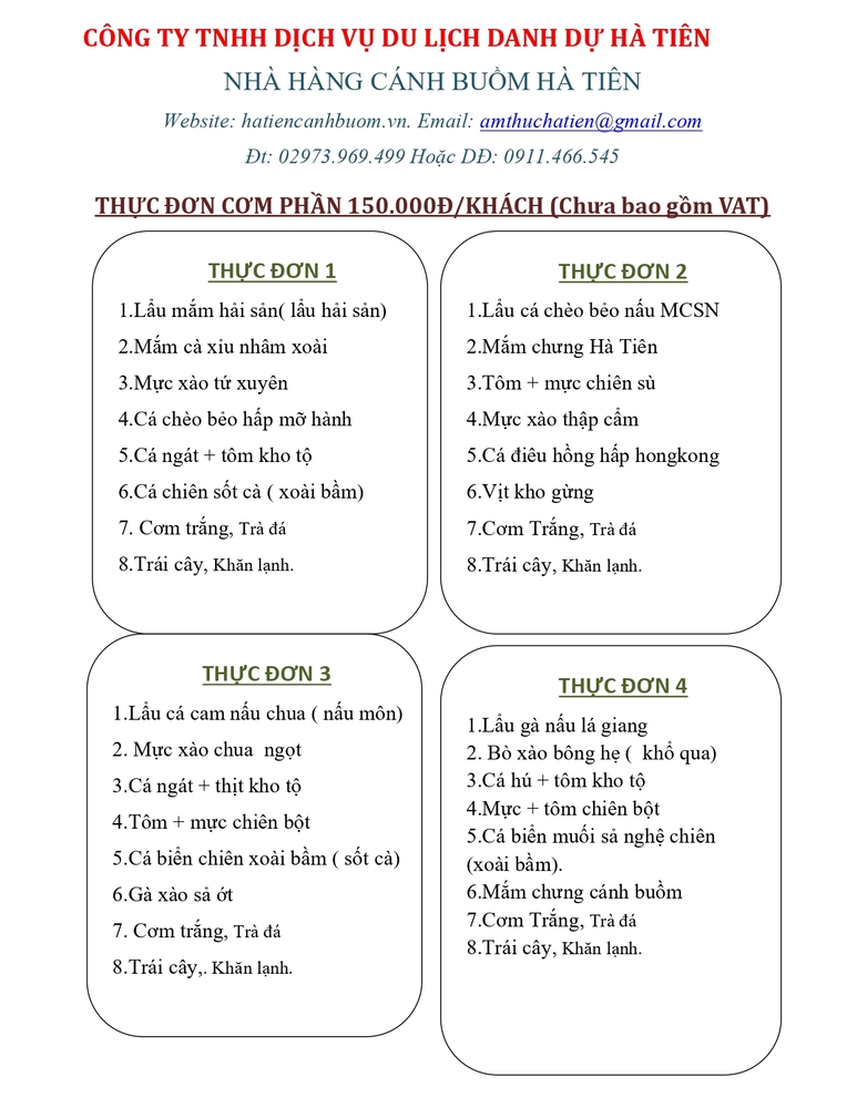 Nhà Hàng Cánh Buồm Hà Tiên chuyên phục vụ: ăn sáng, cơm phần khách đoàn, hải sản tươi sống. Với thực đơn đa dạng, không gian thoáng mát, ngồi bên nhà hàng có thể nhìn thấy cầu Tô Châu, bến phà Thạnh Thới để đi Phú Quốc, cảnh biển view đẹp,… sẽ giúp Quý khách có được chuyến đi vui vẻ và trải nghiệm thú vị.
