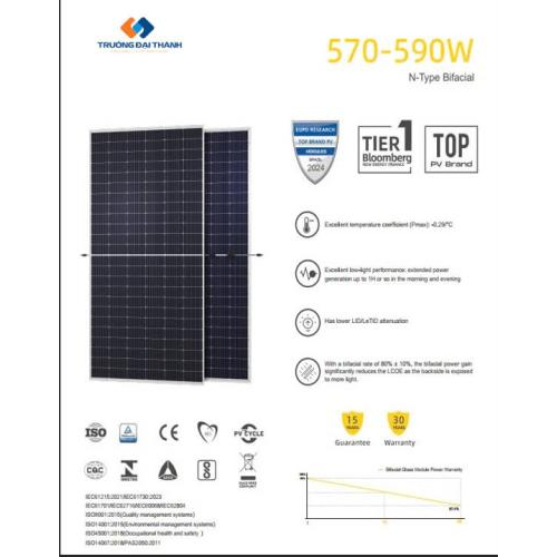 - Công suất mạnh mẽ 590Wp: Tối ưu hóa sản lượng điện cho mỗi mét vuông lắp đặt.