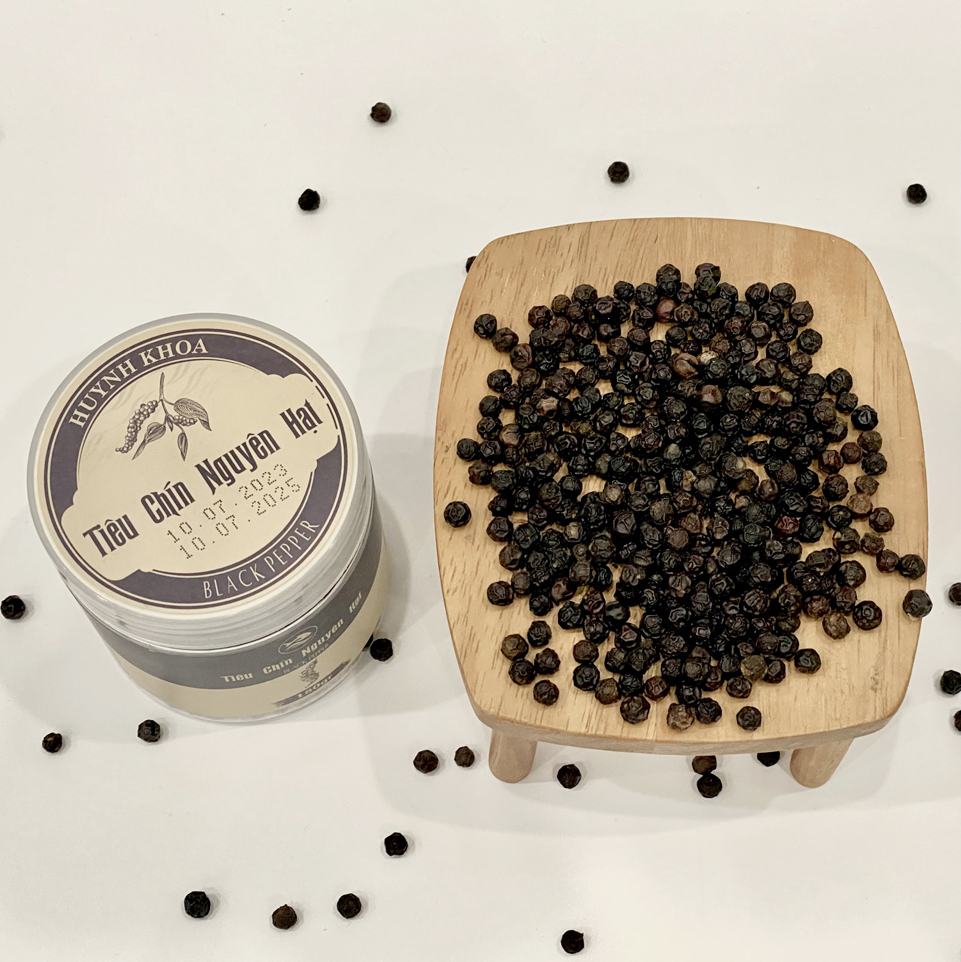 Tiêu đen nguyên hạt là một loại gia vị được lựa chọn và thu hái cẩn thận từ hạt tiêu chín đỏ, sau đó được sấy khô tỉ mỉ, trước khi được đóng gói giữ nguyên hạt. Hạt tiêu sẽ có màu đen và có hương vị cay nồng, thậm chí hơi ngọt. Đây là loại gia vị quen thuộc được sử dụng trong các bữa ăn của gia đình Việt, cũng là một loại gia vị không thể thiếu khi chúng ta muốn món ăn của mình trở nên ngon hơn.
