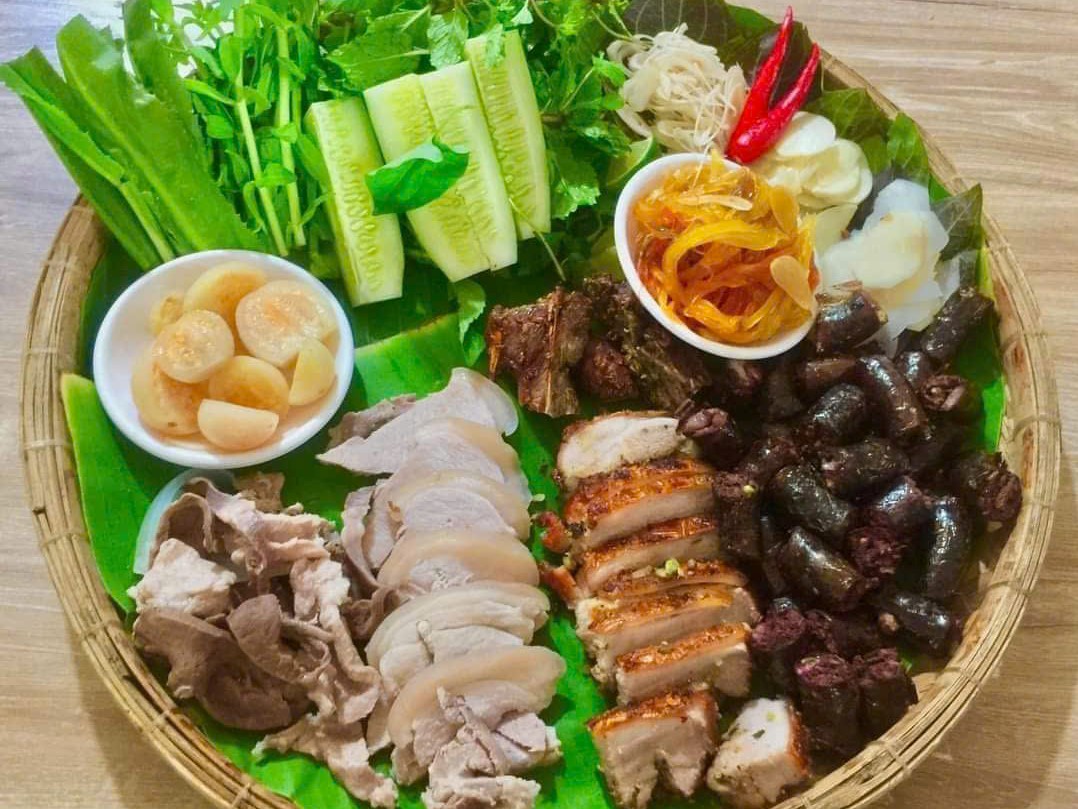 Phần hấp dẫn không kém nằm ở thịt heo quay giòn rụm với lớp da vàng óng, giòn tan hòa với lớp thịt nạc mềm mại chắc chắn sẽ khiến bạn khó lòng mà cưỡng lại. Điểm nhấn đặc biệt cuối cùng không thể không nhắc đến là lòng dồi bởi hương vị đậm đà nhờ sự kết hợp tuyệt vời giữa gia vị truyền thống và tay nghề tinh tế của người đầu bếp. Mỗi miếng lòng dồi là một trải nghiệm trọn vẹn, vừa thơm bùi vừa vừa miệng, không hề gây ngấy. Tất cả các món ăn được sắp xếp đầy khéo léo trên mẹt tre, dùng kèm theo là cà pháo muối giòn cùng mắm tép dậy mùi, và những loại rau sống tươi ngon, Phú Điền tin chắc rằng món ăn sẽ thách thức mọi giác quan của bạn.