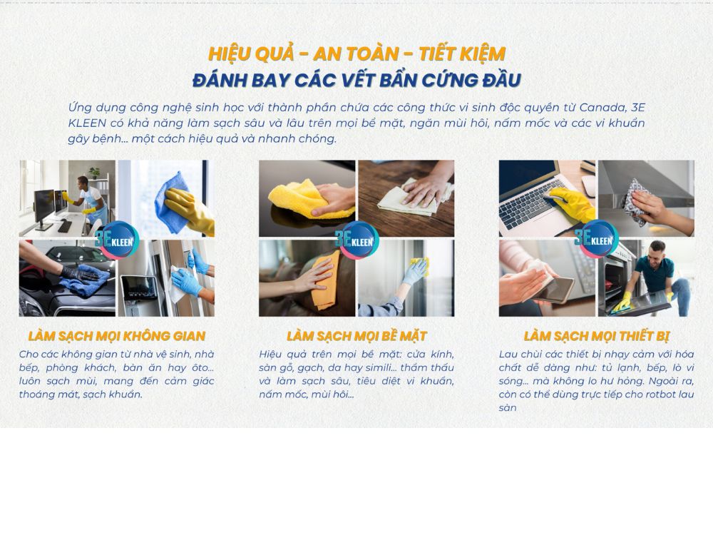 - 3E KLEEN là sản phẩm lau chùi đa năng ứng dụng công nghệ sinh học từ CANADA, với thành phần chứa công thức vi sinh giúp làm sạch lâu và sâu các bề mặt, ngăn mùi và vi khuẩn gây bệnh.
