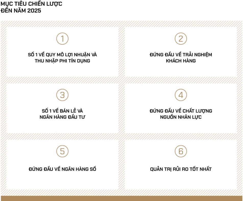 Bằng trí tuệ và tâm huyết, các thế hệ cán bộ Vietcombank đã, đang và sẽ luôn nỗ lực để xây dựng Vietcombank phát triển ngày một bền vững, với mục tiêu đến năm 2025 giữ vững vị trí là ngân hàng số 1 Việt Nam; trở thành một trong 100 ngân hàng lớn nhất khu vực Châu Á; một trong 300 tập đoàn tài chính ngân hàng lớn nhất thế giới, một trong 1.000 doanh nghiệp niêm yết lớn nhất toàn cầu, có đóng góp lớn vào sự phát triển của Việt Nam.