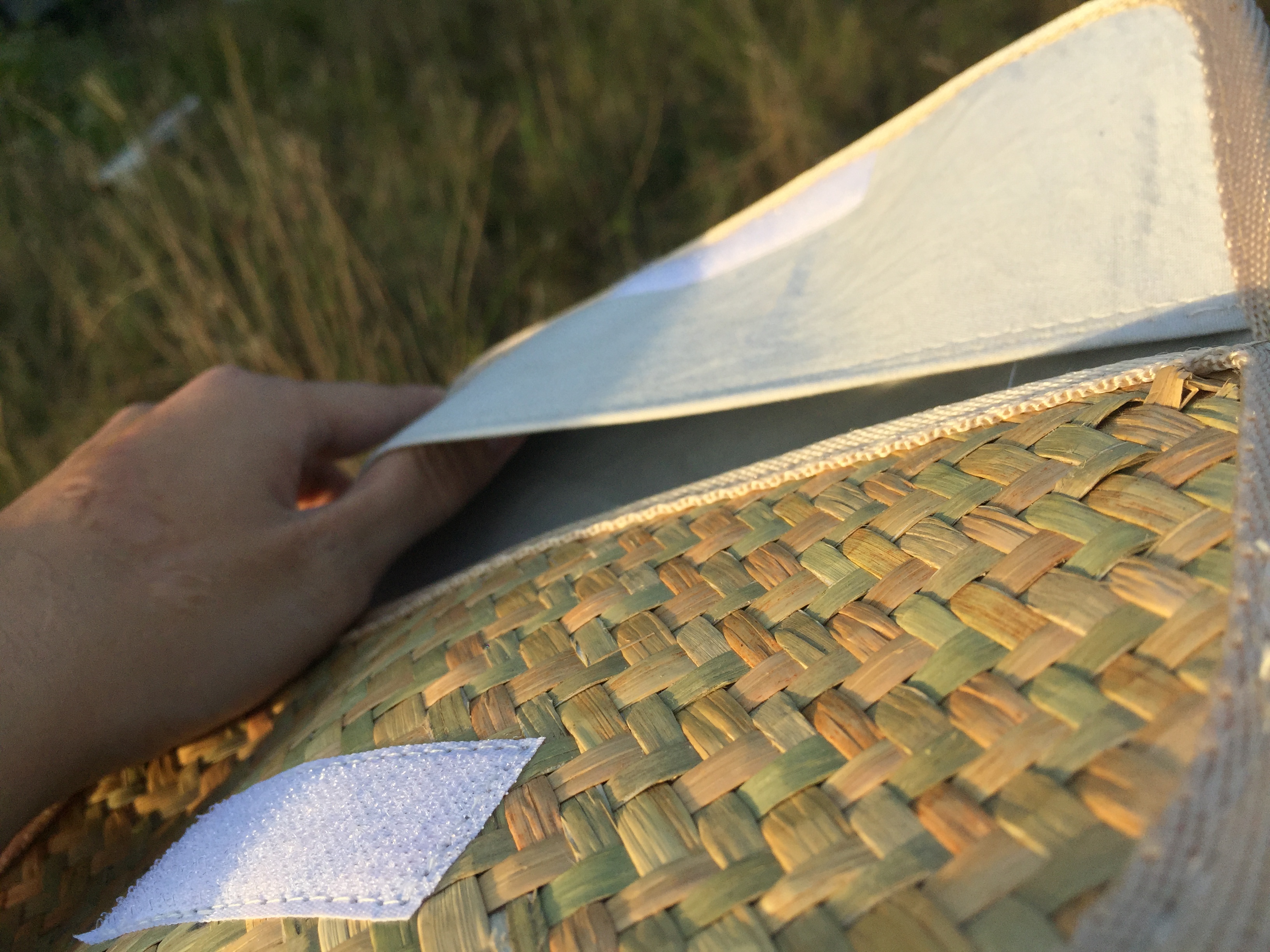 - Lớp ngoài được đan bằng cỏ bàng, với các đường đan tinh tế, tạo nên bộ khung của ví. Lớp viền bằng vải bên ngoài có thể tạo nên cảm giác mềm mại để người dùng để cầm nắm