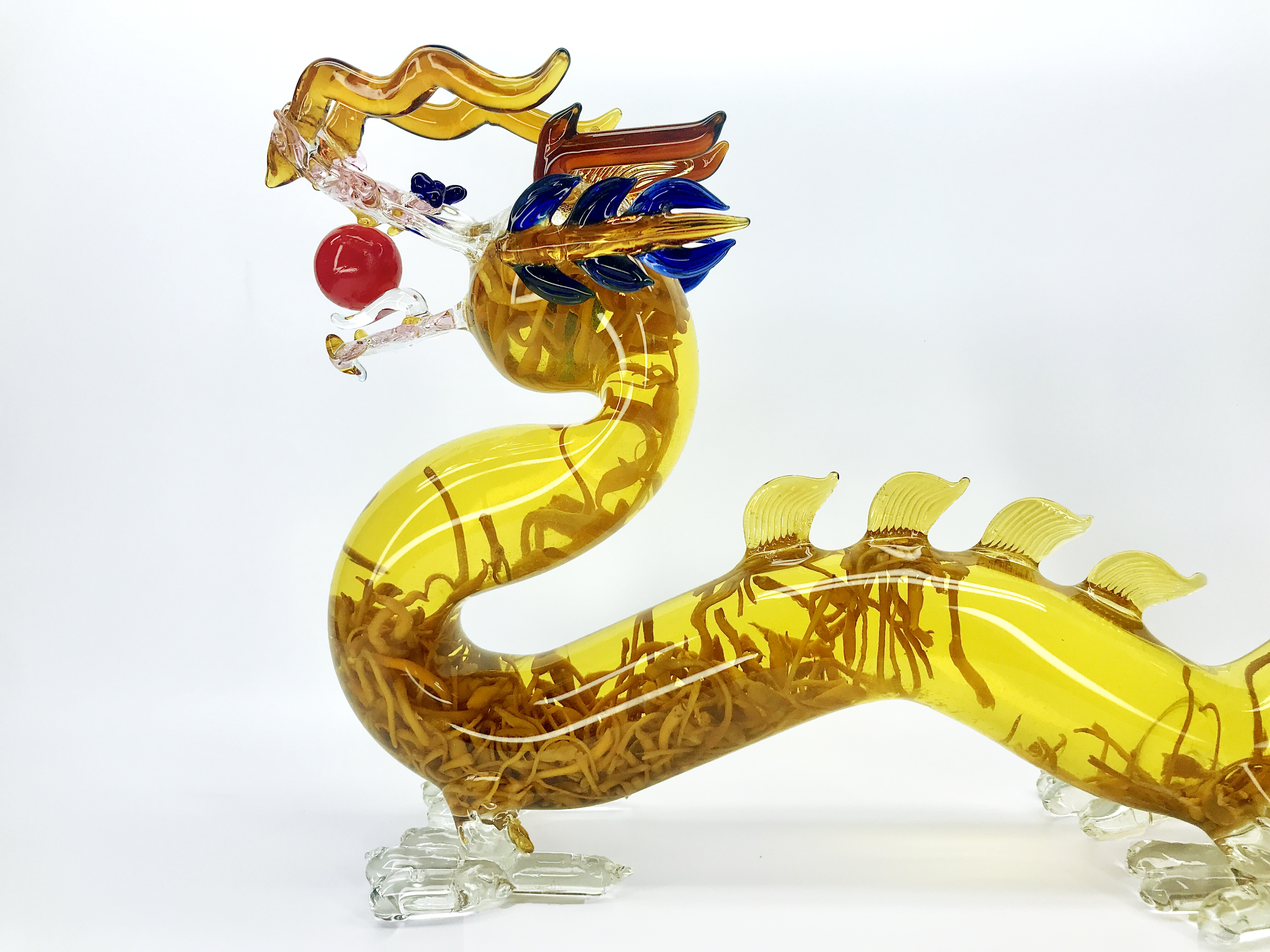 Rượu đông trùng hạ thảo mẫu rồng được làm từ rượu ngon và nấm đông trùng hạ thảo 100%. Được tạo hình rồng sang trọng, trong phong thuỷ, rồng được xem như là tượng trưng cho sự quyền uy, và phú quý cát tường.