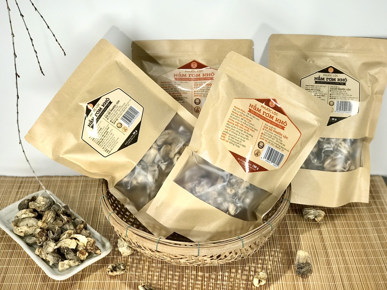 Nấm rơm khô có thành phần chính là nấm rôm tươi 100 được trồng trên rơm Sản phẩm được ứng dụng phương pháp sấy lạnh và bảo quản bằng túi nilong hút chân không