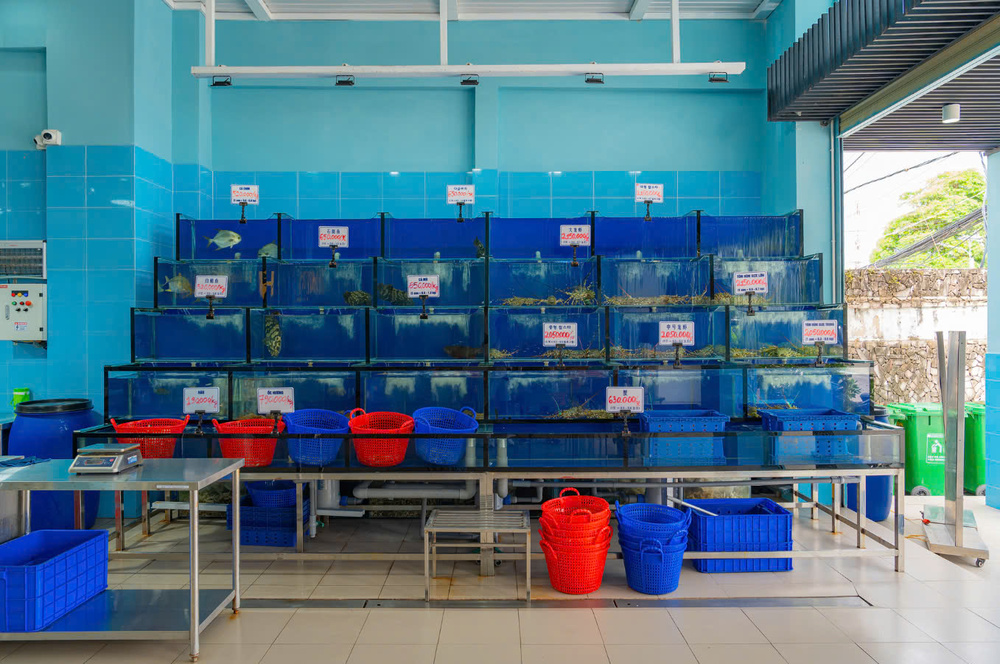 Thực đơn hải sản của Vịnh Xanh Phú Quốc là điểm nhấn đặc sắc, chinh phục cả những thực khách khó tính nhất. Hải sản tại đây được nuôi giữ sống trong bể lớn ngay tại nhà hàng – tôm, cua, ghẹ, cá mú, cá bóp, sò điệp, ốc hương… đều tươi rói, chắc thịt, khách có thể chọn tại chỗ và yêu cầu chế biến theo sở thích.