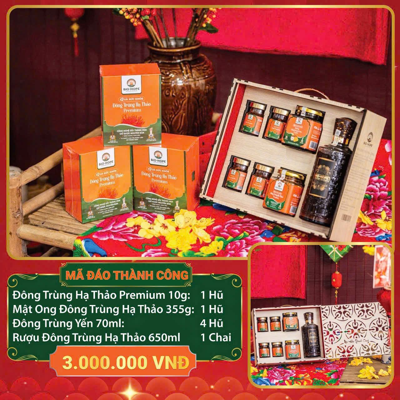 Bộ Quà Tặng Mã Đáo Thành Công là sự kết hợp tinh tế giữa các sản phẩm cao cấp như Đông Trùng Hạ Thảo, Đông Trùng Mật Ong, Rượu Đông Trùng và Yến chưng, được đặt trong hộp gỗ sang trọng. Món quà không chỉ thể hiện sự đẳng cấp mà còn gửi gắm lời chúc sức khỏe, may mắn và thành công đến người nhận.