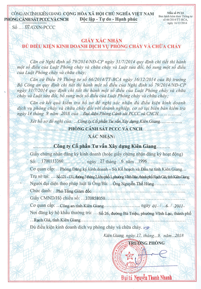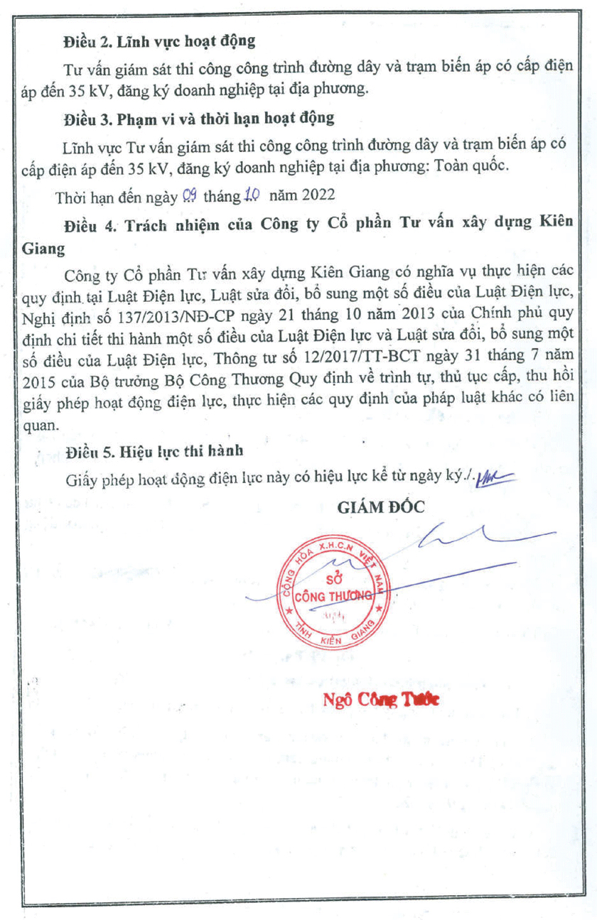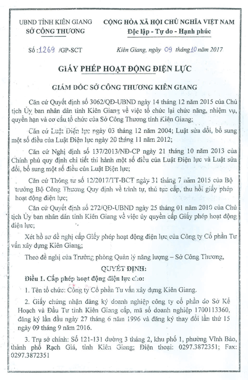 Ngày 15/6/1996 Chủ tịch UBND tỉnh ký Giấy phép thành lập công ty cổ phần số 003347 GP/TLDN-03 với các nội dung: Tên công ty: CÔNG TY CỔ PHẦN TƯ VẤN XÂY DỰNG KIÊN GIANG - Trụ sở: số 19C, Minh Mạng, phường Vĩnh Thanh Vân, thị xã Rạch Giá, tỉnh Kiên Giang - Ngành nghề kinh doanh: Lập báo cáo tiền khả thi và khả thi; Khảo sát, quy hoạch, thiết kế; tư vấn thẩm định; lập và đánh giá hồ sơ dự thầu; giám sát kỹ thuật; kiểm định chất lượng; quản lý dự án; thi công thử nghiệm và trang trí nội thất các công trình đặc biệt được UBND tỉnh cho phép – Vốn điều lệ: 500.000.000đ (năm trăm triệu đồng) – Thời gian hoạt động: 30 năm.