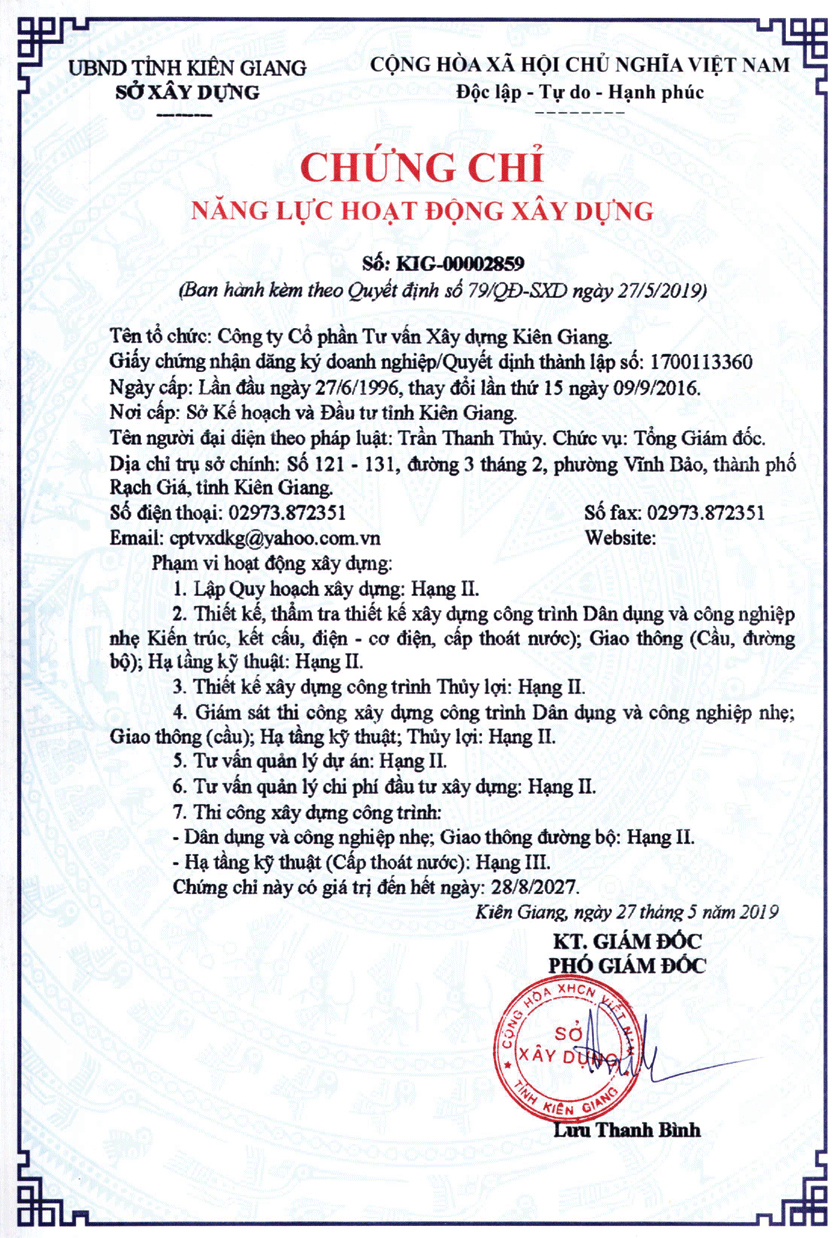 Ngày 15/6/1996 Chủ tịch UBND tỉnh ký Giấy phép thành lập công ty cổ phần số 003347 GP/TLDN-03 với các nội dung: Tên công ty: CÔNG TY CỔ PHẦN TƯ VẤN XÂY DỰNG KIÊN GIANG. Trụ sở: số 19C, Minh Mạng, phường Vĩnh Thanh Vân, thị xã Rạch Giá, tỉnh Kiên Giang.