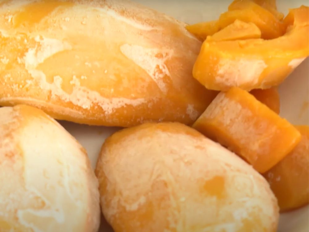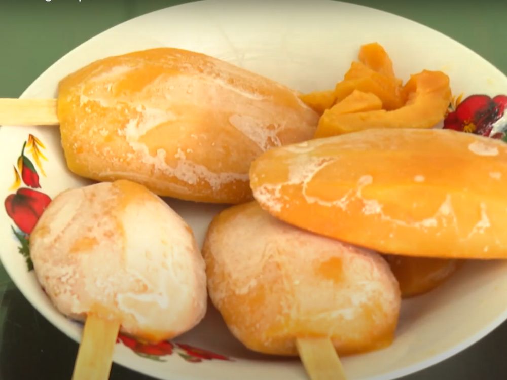 Những trái xoài Cát chu được trồng hoàn toàn theo tiêu chuẩn an toàn, chín tự nhiên. Sau khi lột vỏ, hai bên má xoài được dùng làm kem, được xử lý qua nước muối để đảm bảo vệ sinh giữ được độ cứng đẹp và hương vị đậm đà đặc trưng. Sau đó để ráo nước, xiên que và đưa đi cấp đông.