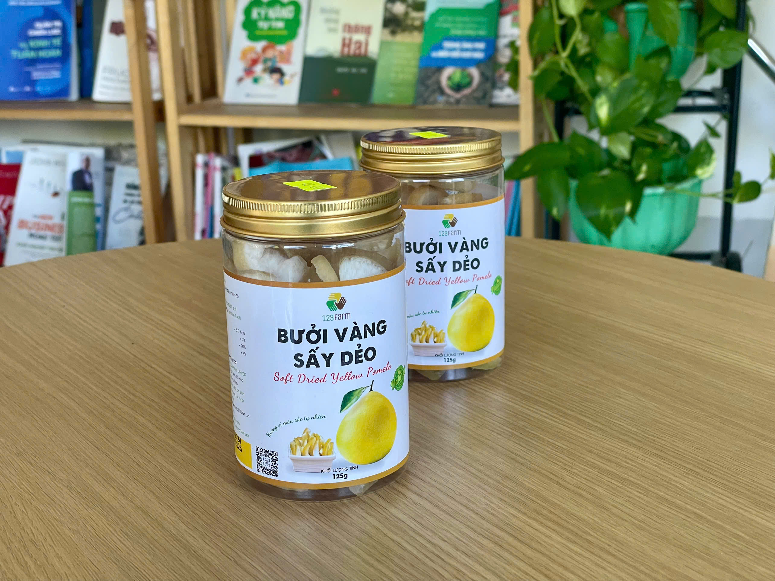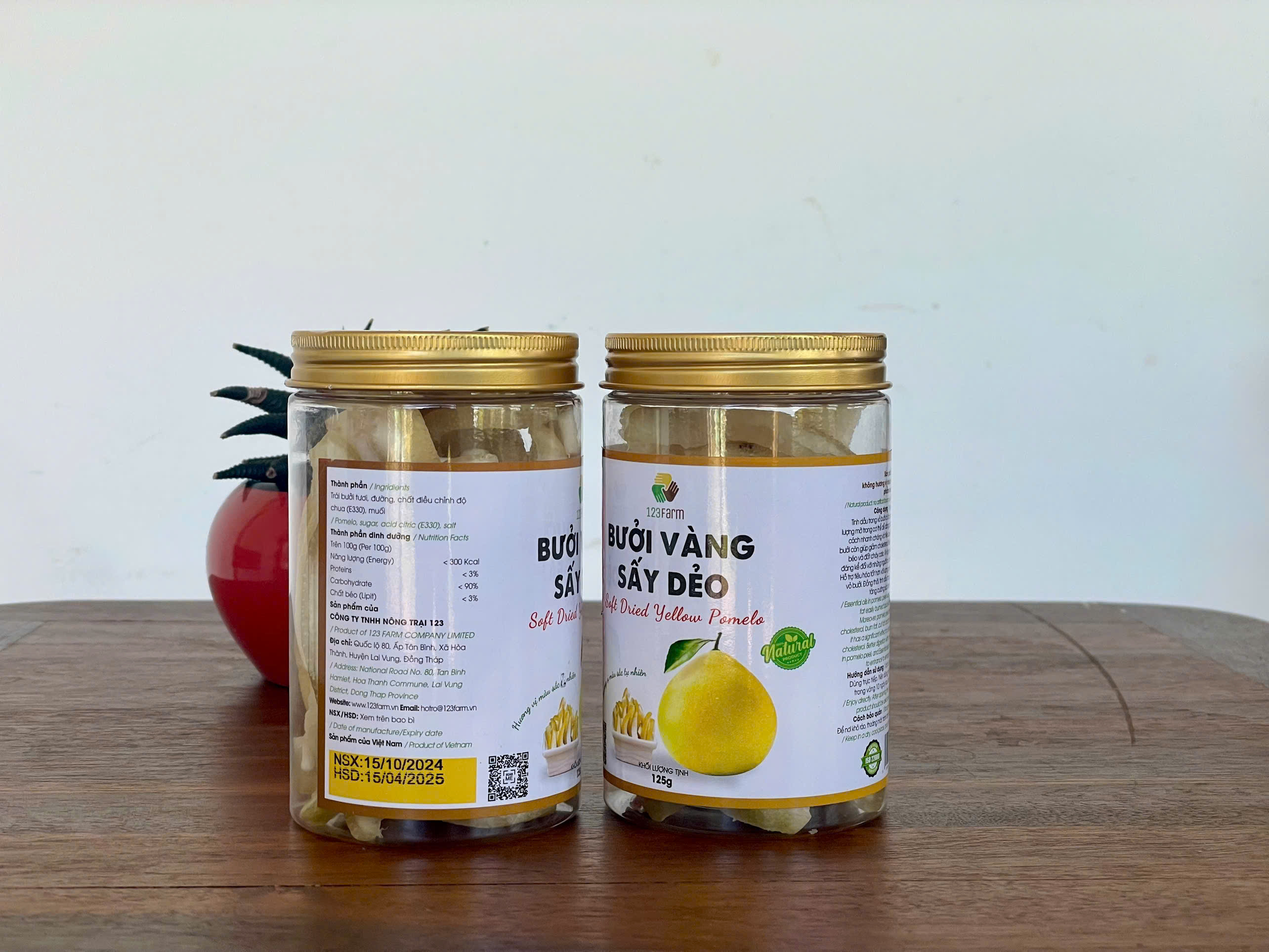 Trái bưởi chín được tuyển chọn từ những nông trại uy tín chất lượng, kết hợp với quy trình sản xuất theo công thức chế biến riêng biệt của 123 Farm, qua quá trình sấy dẻo, tạo ra sản phẩm mềm dẻo, có vị the của tinh dầu bưởi, kết hợp hài hòa với vị chua và vị ngọt thanh, thơm nhẹ hương Bưởi. Sản phẩm từ thiên nhiên, không phẩm màu hóa học, an toàn cho sức khỏe.