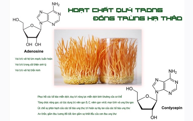 - Hoạt chất melanin: Tạo sắc tố đen cho Đông trùng hạ thảo, có tác dụng nhặt "rác" là gốc tự do, chống oxy hoá mạnh, và thải loại các ion kim loại độc hại