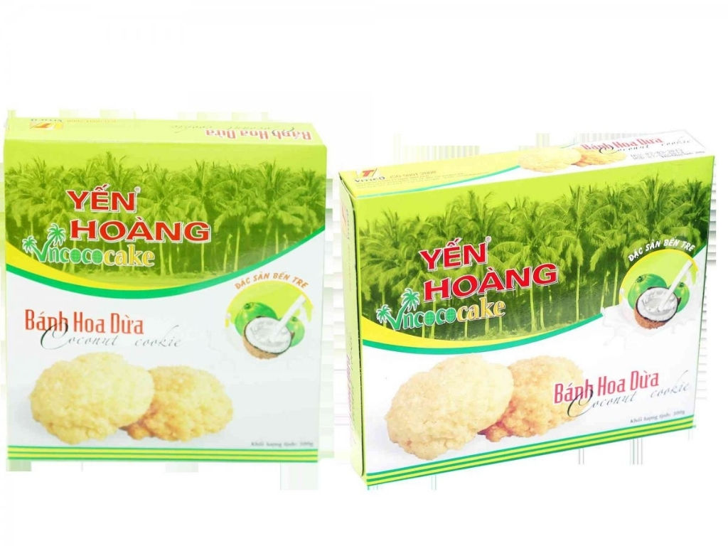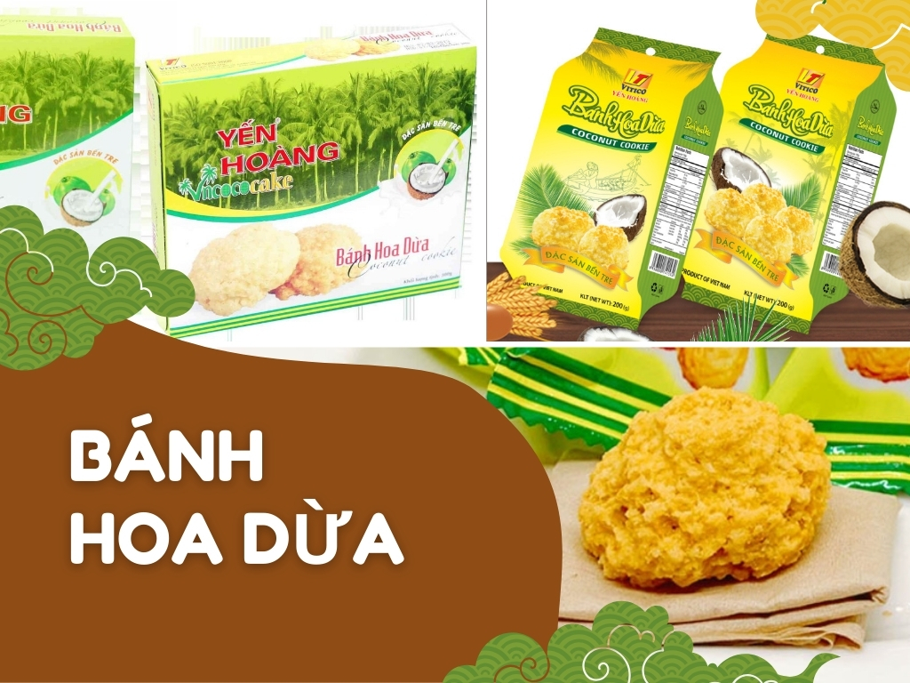 Bánh hoa dừa: Có hình nụ hoa dừa, mang hương vị dừa bến tre, thành phần: tạo từ cơm dừa, sấy thô, bột mì.
