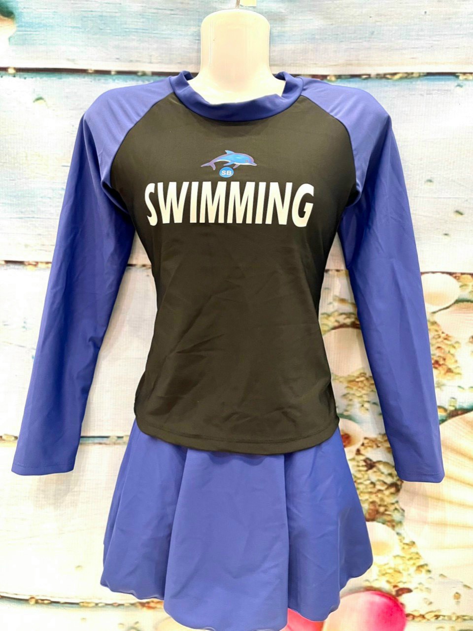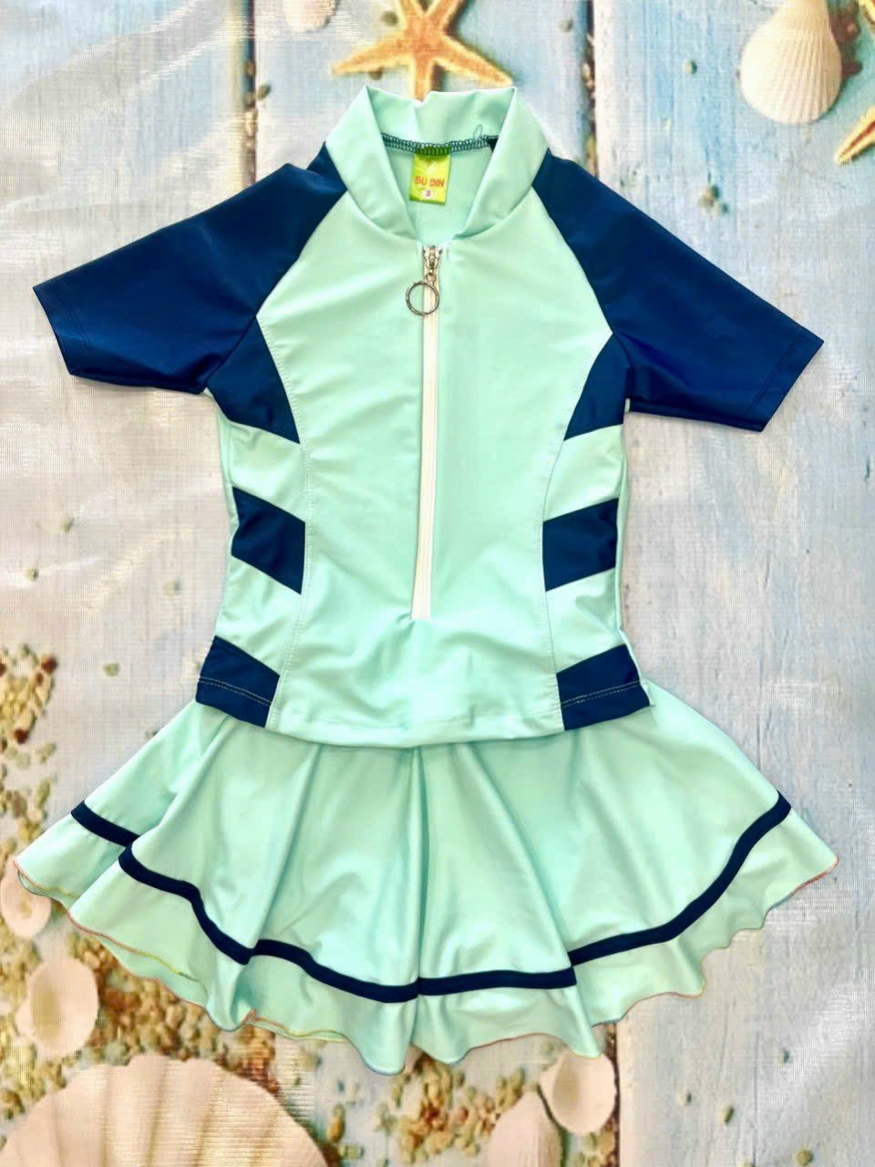 - Set 2 món gồm áo bơi cộc tay và quần rời giả váy.