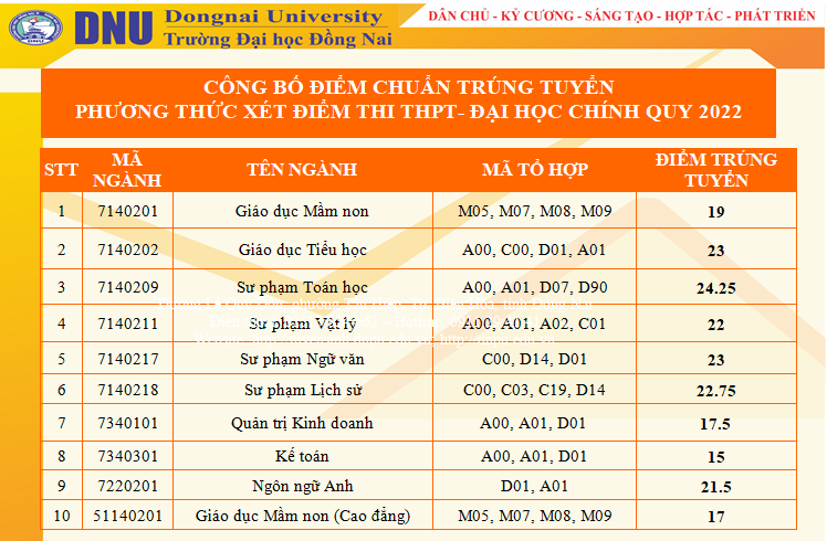 Theo thông tin chính thức được công bố từ Hội đồng tuyển sinh trường đại học Đồng Nai, ngành có điểm chuẩn theo phương thức xét điểm thi tốt nghiệp THPT 2022 cao nhất là Sư phạm Toán học với mức "chốt" là 24,25 điểm.