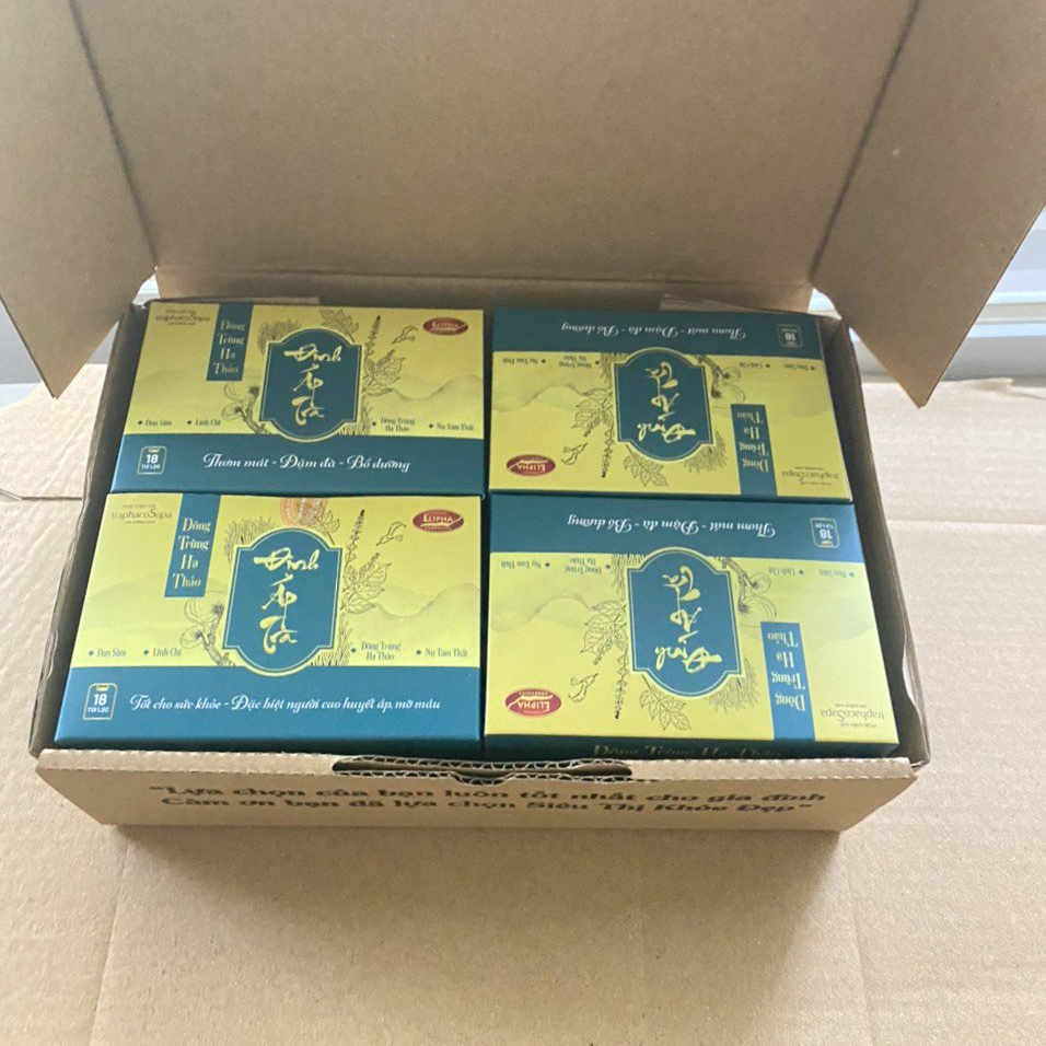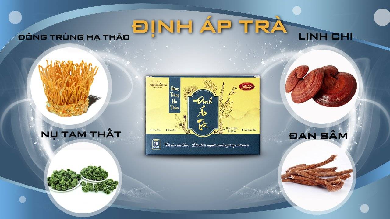 Đông Trùng Hạ Thảo Định Áp Trà lấy cảm hứng từ thảo dược vùng núi cao Sapa, là sự kết hợp hoàn hảo giữa đông trùng hạ thảo bán tự nhiên của TraphacoSapa và các dược liệu quý tạo nên một thức uống đậm đà, cân bằng và tốt cho sức khỏe, đặc biệt tốt cho người mắc bệnh liên quan đến tim mạch như cao huyết áp, rối loạn lipid máu (mỡ máu).