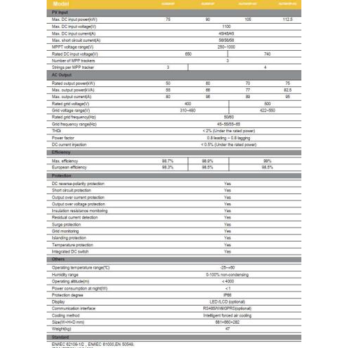 Biến tần năng lượng mặt trời 3 pha công suất 60kW được thiết kế để hoạt động hiệu quả trong nhiều điều kiện môi trường khác nhau. Công suất lớn giúp đảm bảo nguồn điện đầu ra mạnh mẽ và liên tục, lý tưởng cho các hoạt động sản xuất, kinh doanh cần độ tin cậy cao.