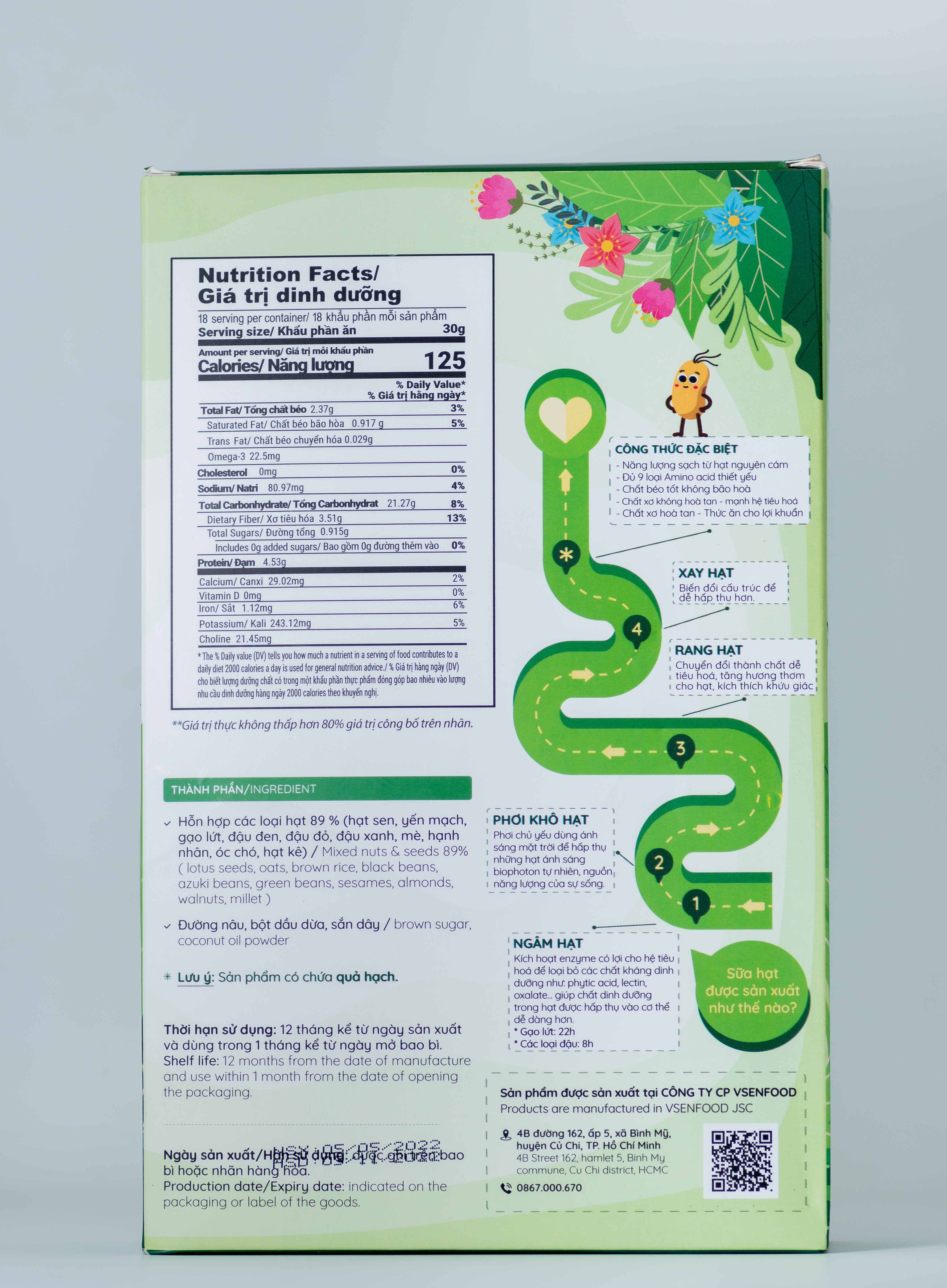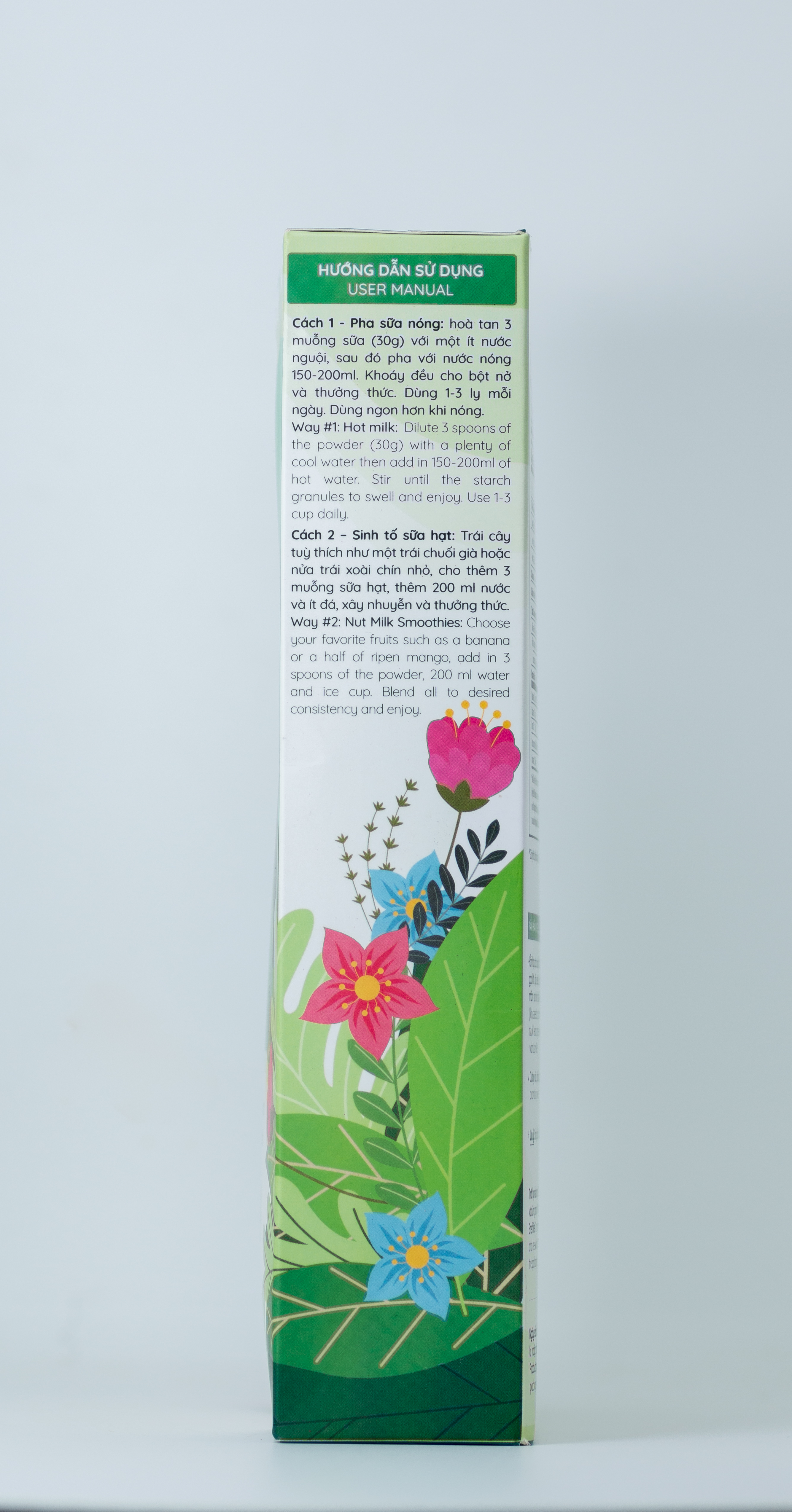 Thành phần: yến mạch, hạt sen, gạo lứt, hạt kê, đậu đỏ, đậu đen, đậu xanh, mè vàng, hạnh nhân, óc chó, bột kem thực vật.