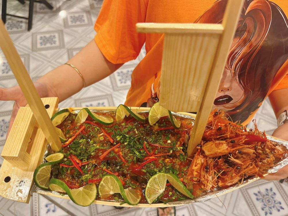 Tôm sống sơ chế cùng với sốt thái công thức Làng Chài vẫn giữ được độ ngọt tự nhiên của tôm. Được bài trí trên chiếc ghe mini giúp món ăn thêm lạ mắt.