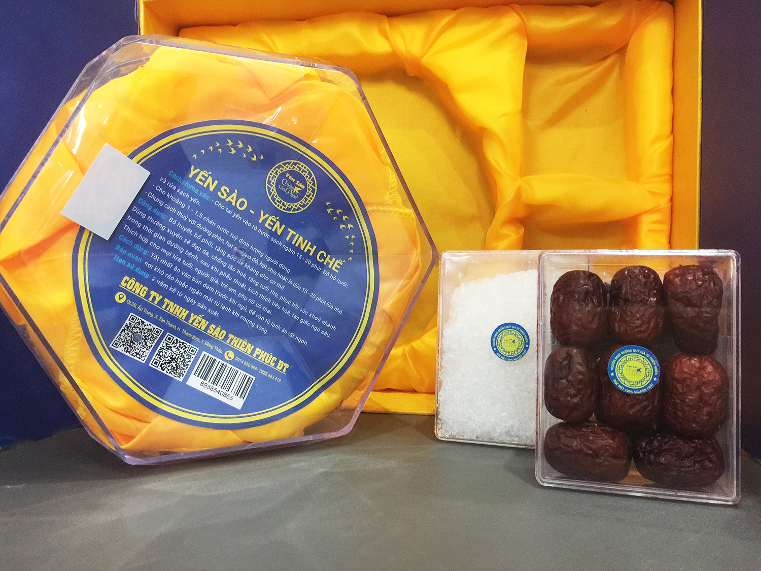 - Thành phần: Tổ yến nguyên liệu đã làm sạch lông và tạp chất, táo tàu, đường phèn, hộp