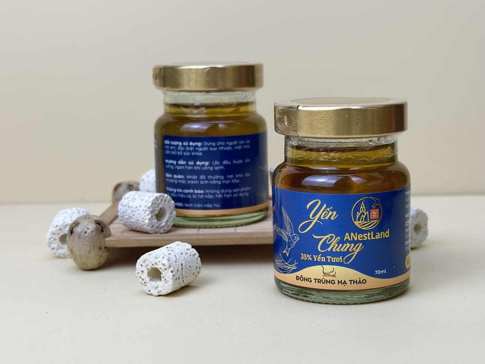 Yến Chưng Đông Trùng Hạ Thảo là sản phẩm cao cấp được sản xuất bởi Công ty TNHH MTV ANestLand, kết hợp hoàn hảo giữa yến tươi tinh chế và đông trùng hạ thảo tươi. Đây là sự lựa chọn tuyệt vời cho những ai mong muốn duy trì sức khỏe và sắc đẹp tự nhiên, đồng thời tận hưởng hương vị thơm ngon, tinh khiết từ thiên nhiên.
