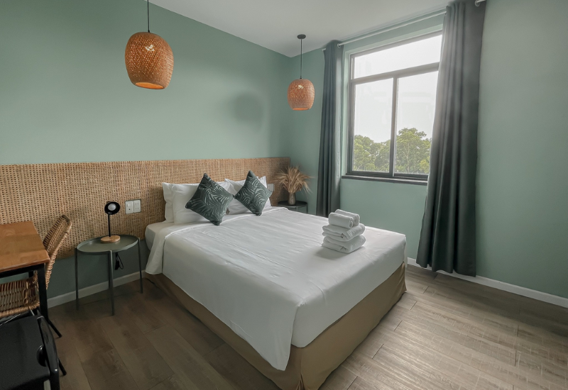 Leaf Hotel Phú Quốc là khách sạn sao mang phong cách hiện đại, tinh tế, nổi bật với thiết kế kết hợp hài hòa giữa gam màu trắng và xanh ngọc, tạo cảm giác thư giãn và gần gũi với thiên nhiên. Với định hướng phát triển du lịch bền vững, khách sạn sử dụng các vật dụng thân thiện với môi trường như dép cói, nước thủy tinh, nói không với nhựa dùng một lần. Hệ thống phòng nghỉ đa dạng từ Superior, Deluxe đến Family Suite, có diện tích rộng rãi, ban công thoáng mát và đầy đủ tiện nghi như minibar, két sắt, Wi-Fi tốc độ cao, điều hòa, TV, cùng các tiện ích chất lượng như nhà hàng, quán café sân thượng, cho thuê xe máy, tour địa phương và dịch vụ đưa đón sân bay. Không chỉ gây ấn tượng bởi không gian sạch sẽ, decor tinh tế và bữa sáng phong phú, Leaf Hotel còn được đánh giá cao bởi đội ngũ nhân viên thân thiện, luôn sẵn sàng hỗ trợ chu đáo. Đây là lựa chọn lý tưởng dành cho các cặp đôi, gia đình hoặc nhóm bạn đang tìm kiếm kỳ nghỉ yên bình, tiện nghi và gần gũi với thiên nhiên tại Phú Quốc.