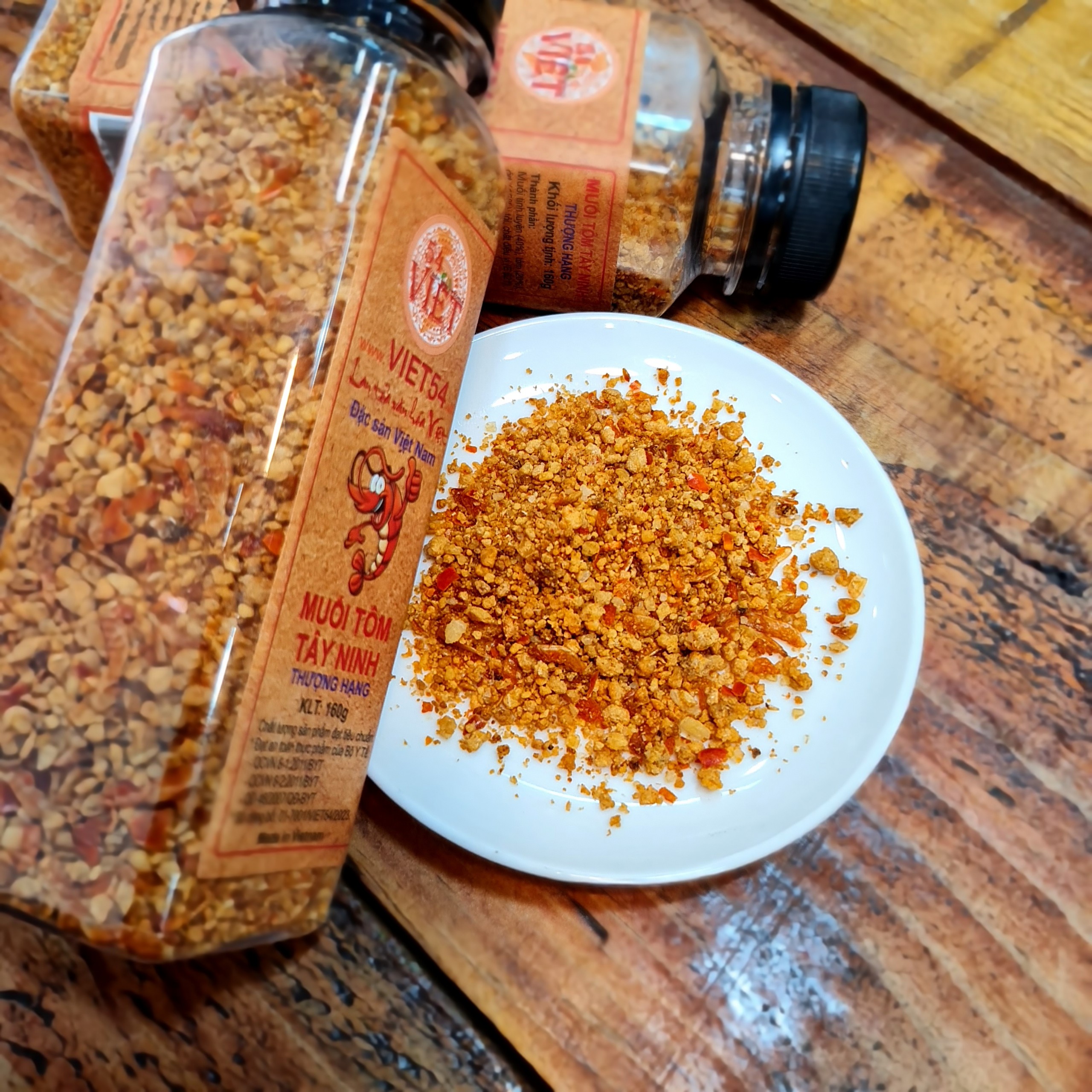 Muối tôm Tây Ninh là đặc sản nổi tiếng, được làm từ tôm khô, muối tinh luyện và ớt cay, mang hương vị đậm đà, thơm ngon đặc trưng. Với vị mặn, ngọt và cay hài hòa, muối tôm là gia vị hoàn hảo để chấm trái cây, rau củ hoặc làm tăng hương vị cho các món ăn. Sản phẩm không chỉ là gia vị mà còn là nét tinh hoa ẩm thực của vùng đất Tây Ninh.