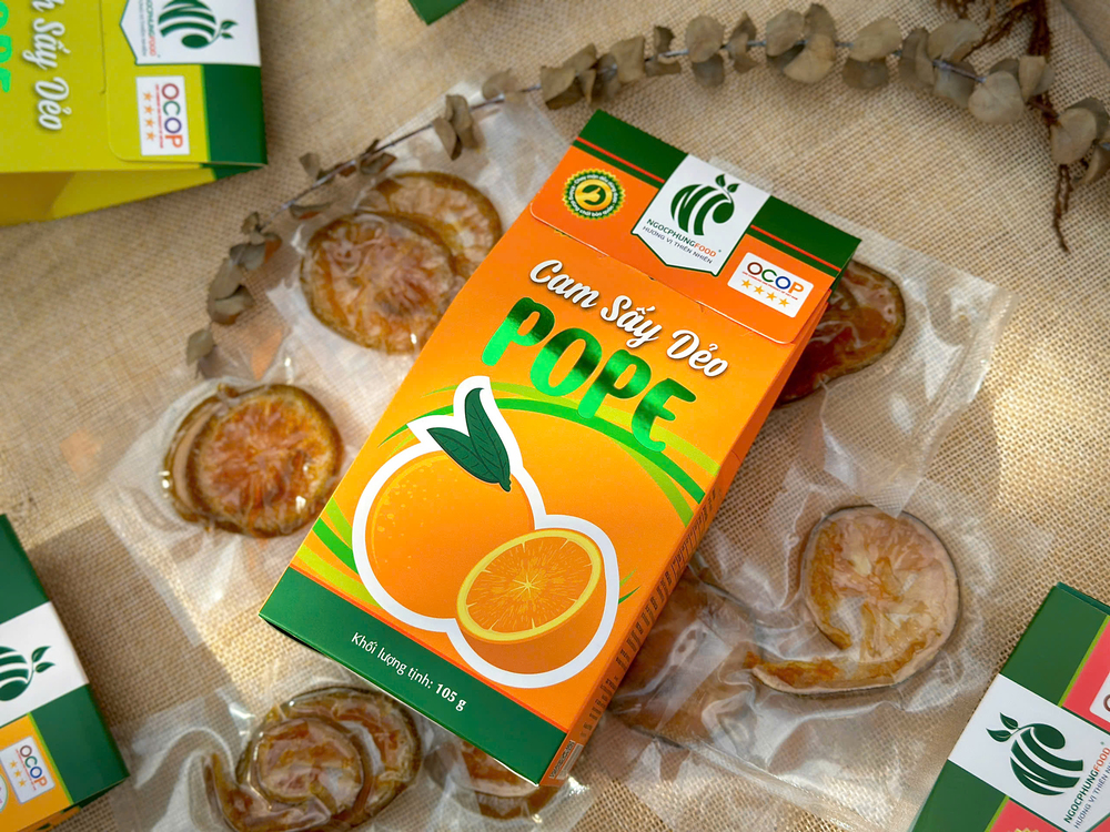 Sản phẩm đã được chứng nhận OCOP 4 sao, khẳng định chất lượng và uy tín trên thị trường. Không chứa chất bảo quản, Cam Sấy Dẻo POPE là sự lựa chọn an toàn tuyệt đối cho sức khỏe người tiêu dùng. Sản phẩm phù hợp với mọi lứa tuổi và dễ dàng mang theo khi đi làm, đi học, hay trong những chuyến du lịch, trở thành món ăn vặt lý tưởng cho những ai yêu thích sự tiện lợi mà vẫn đảm bảo hương vị thơm ngon và lành mạnh.