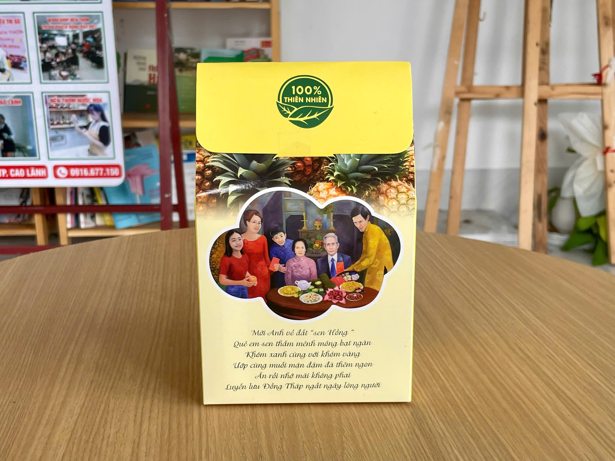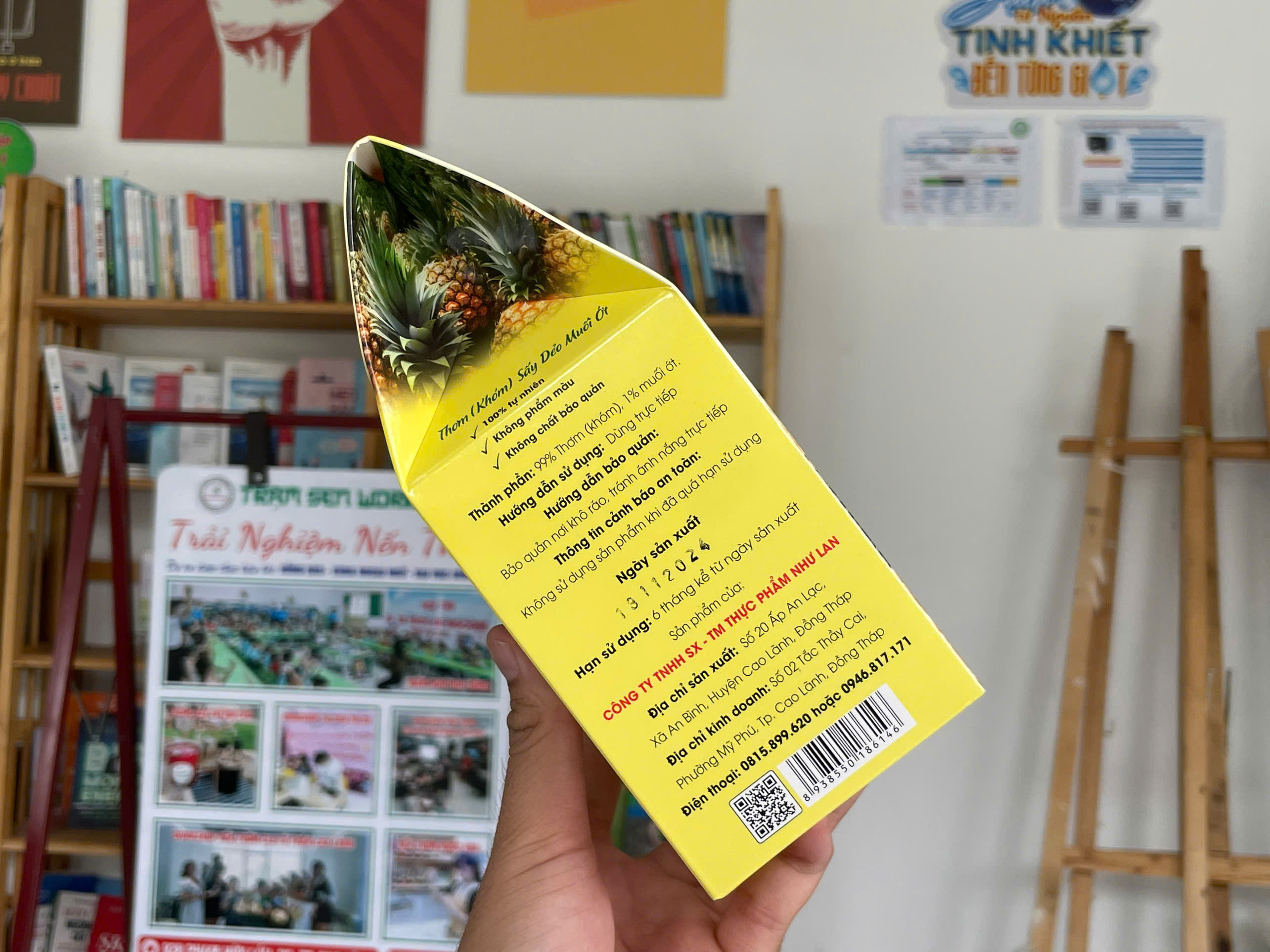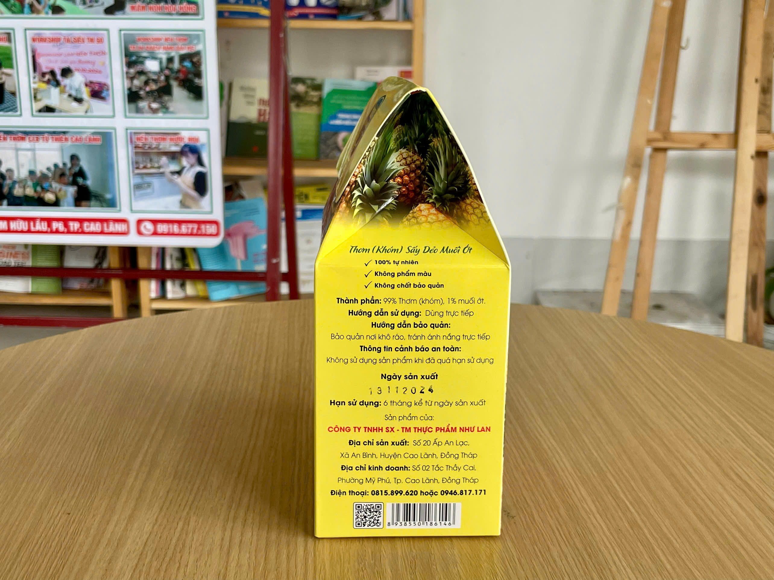 Sau khi sấy, Thơm được trộn đều với gia vị muối ớt, mang đến sự hòa quyện độc đáo giữa độ chua ngọt tự nhiên của trái khóm và vị cay, mặn đặc trưng. Món ăn này không chỉ hấp dẫn bởi hương vị mà còn rất tiện lợi và dễ mang theo, là lựa chọn lý tưởng cho những dịp du lịch, picnic, hay những buổi tụ tập bạn bè, hoặc nhâm nhi khi xem phim.