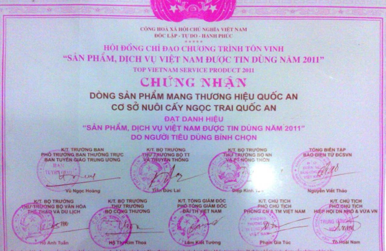 Trong những năm hình thành và phát triển, Ngọc trai Quốc An đã đạt được những thành quả nhất định và được nhiều tổ chức về thương mại, kinh tế và hội người tiêu dùng đánh giá cao...