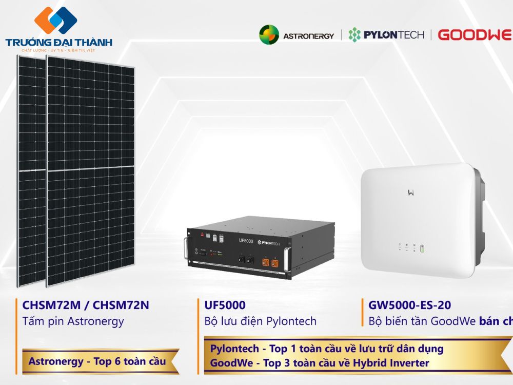 Combo Thiết Bị Điện Năng Lượng Mặt Trời 10kW/10.24kWh-1pha là giải pháp toàn diện cho hệ thống điện mặt trời gia đình, bao gồm các thành phần chính như Tấm pin năng lượng mặt trời Astro 5 Semi - CHSM72M - HC - 550, được thiết kế để tối ưu hóa thu lượng điện mặt trời trong mọi điều kiện ánh sáng. Bộ biến tần GoodWe GW5000-ES-20 chuyển đổi điện năng từ DC sang AC với hiệu suất cao và độ ổn định, đảm bảo nguồn điện liên tục cho gia đình. Bộ lưu điện UF5000 của hãng Pylontech, với công nghệ Lithium Iron Phosphate đem lại hiệu suất lưu trữ cao và độ bền bỉ. Tổng thể, Combo Thiết Bị Điện Năng Lượng Mặt Trời này không chỉ giúp tiết kiệm chi phí điện mà còn đảm bảo sự bền vững và ổn định cho hệ thống điện mặt trời gia đình.