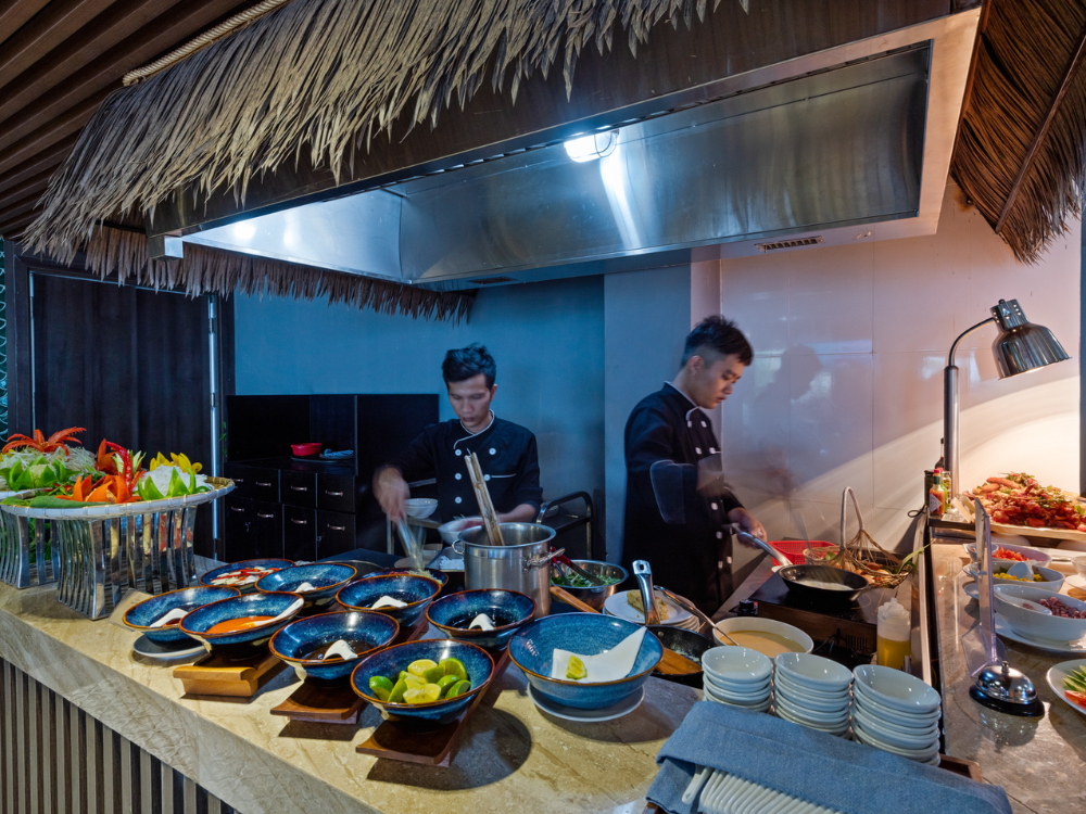 Nhà hàng Soleil Fusion sở hữu lối kiến trúc sang trọng, trang nhã, ấn tượng với không gian 2 tầng rộng rãi, thoáng mát, có sức chứa lên tới 160 thực khách. Tầng 1 là không gian trong nhà chuyên phục vụ buffet với các món ăn Âu, Á đa dạng, những món ăn đặc trưng của mâm cơm Việt đến từ 3 miền Bắc - Trung - Nam. Tầng 2 là không gian ngoài trời được bao quanh bởi thiên nhiên, mây trời Phú Quốc với tầm nhìn ra vịnh biển và núi rừng, chuyên phục vụ các món ăn được làm từ chính hải sản đảo ngọc. Với đội ngũ nhân viên phục vụ nhiệt tình, thân thiện cùng các đầu bếp tài hoa của nhà hàng, Soleil Fusion sẽ đem đến cho du khách những chuyến du hành khám phá ẩm thực trọn vẹn và đáng nhớ nhất.